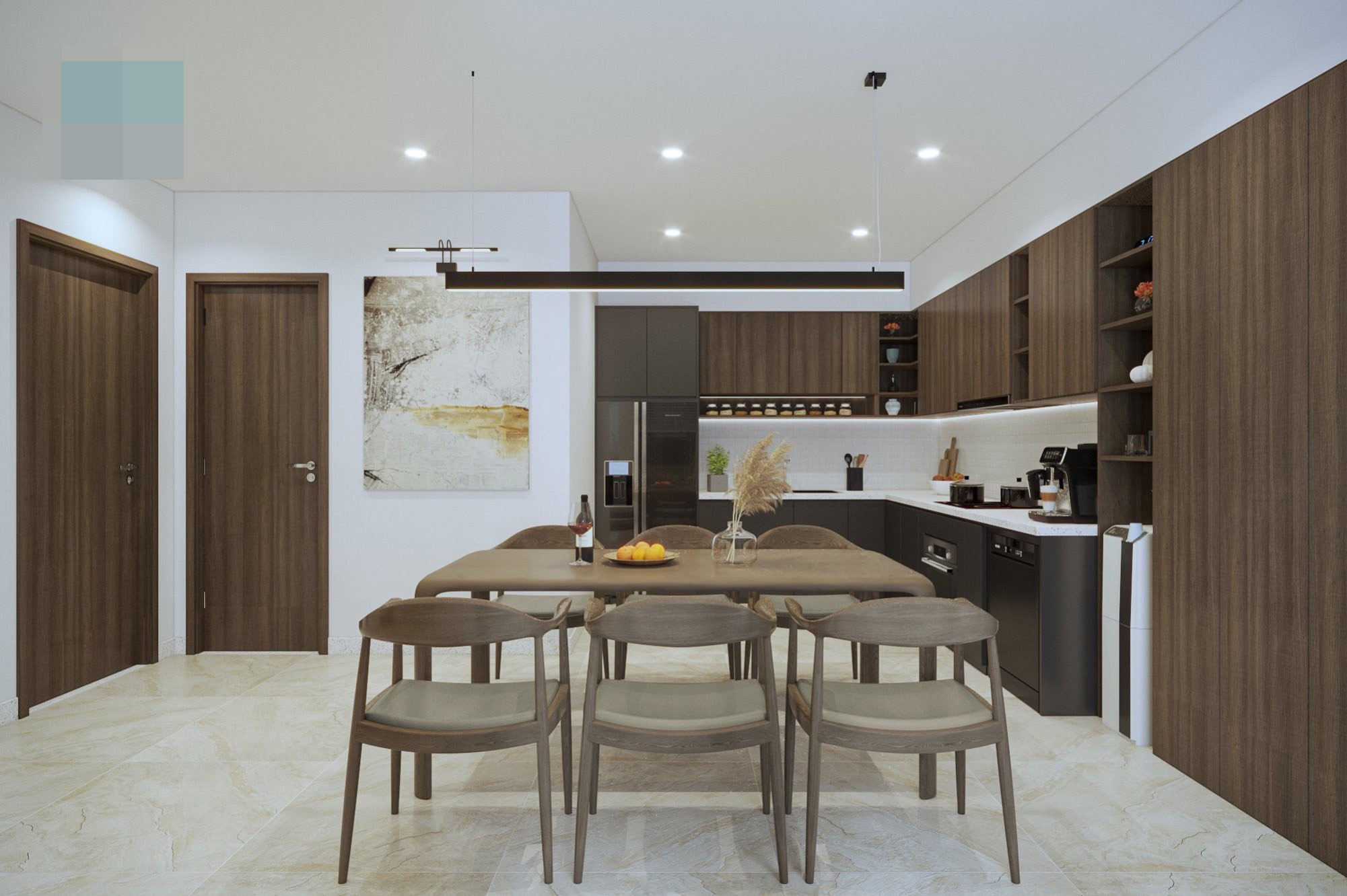 Bàn ghế ăn mang màu nâu gỗ, nổi bật trên sắc trắng của ngôi nhà. Phòng bếp sáng thoáng, rộng rãi với hệ tủ bếp chữ L cùng tone màu bàn ăn. Hệ tủ lớn là kho chứa đồ gọn gàng.