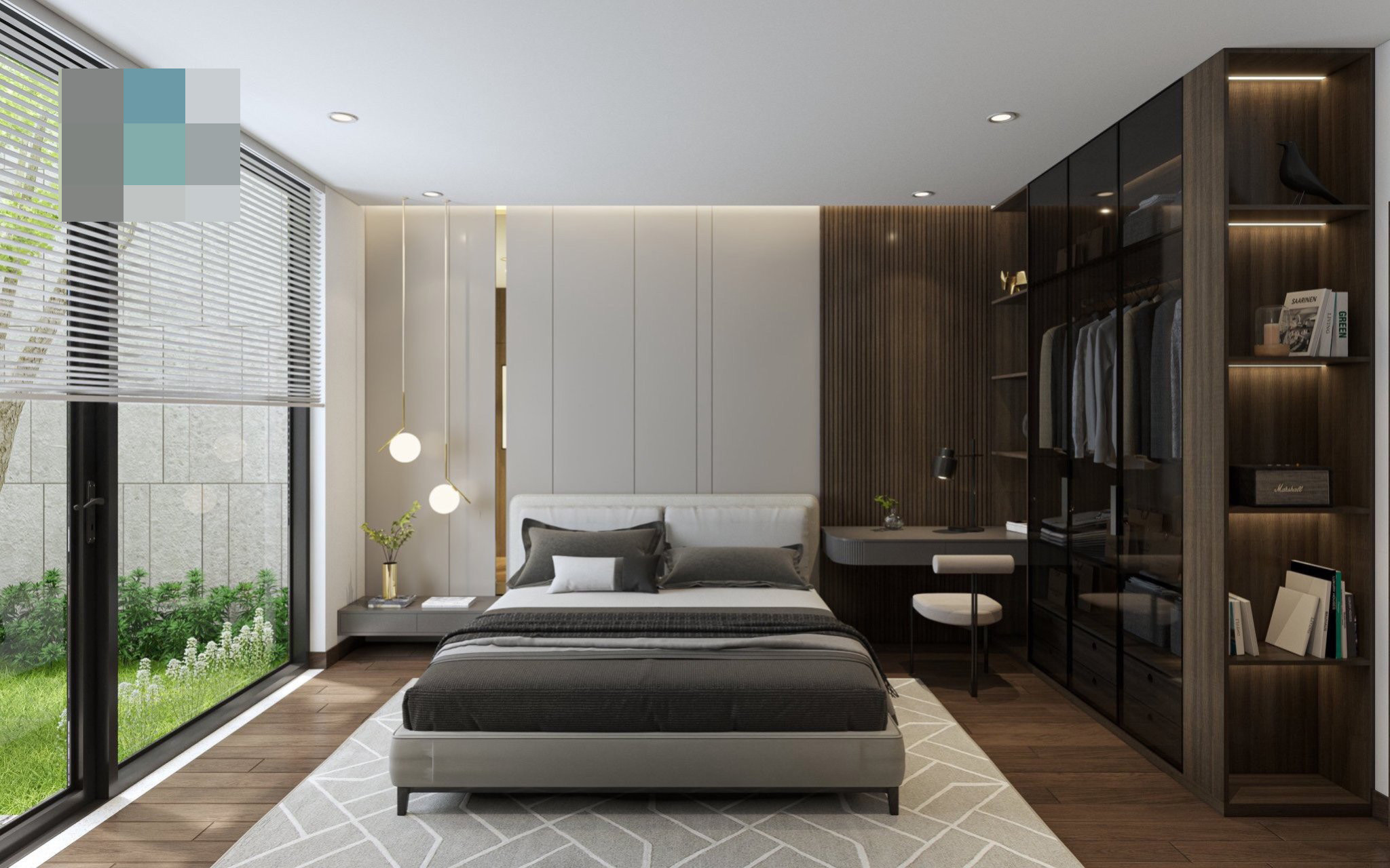 Các phòng ngủ bài trí đơn giản, hiện đại, tối giản đồ nội thất để nhường chỗ cho không gian sinh hoạt. Phòng ngủ master ở tầng 1 có view nhìn ra sân vườn thật chill và trong lành.