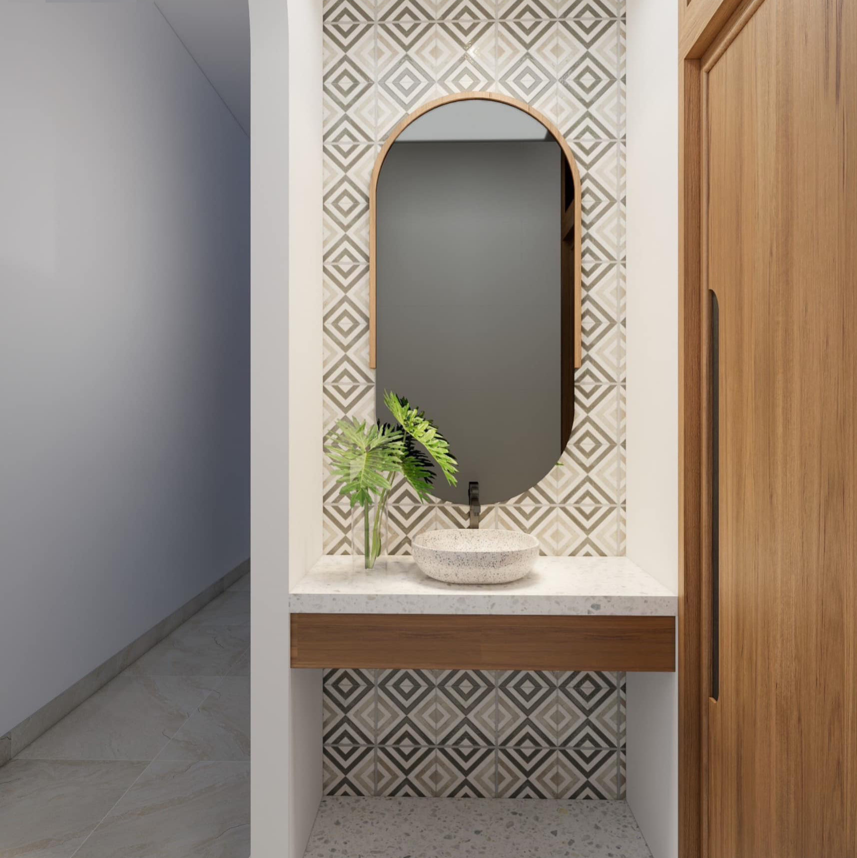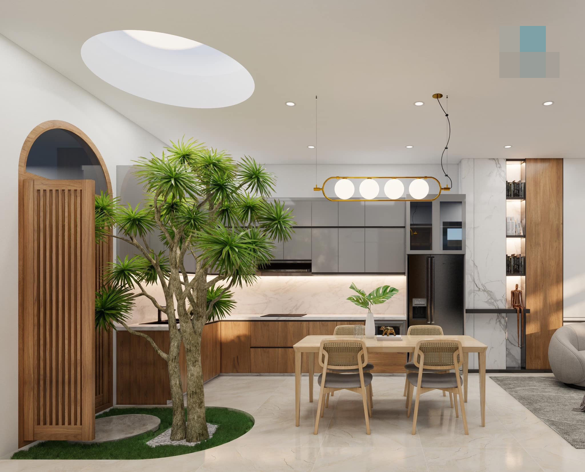Giếng trời nhỏ nhưng có vai trò rất lớn trong việc hút mùi ở bếp, lấy ánh sáng trời cho nhà. Phía sau cây thần tài núi có cánh cửa vào khu vệ sinh - một giải pháp tạo cảnh quan đẹp, đồng thời tránh được yếu tố phạm phong thủy cửa nhà vệ sinh đối diện cửa chính. Cây thần tài núi cũng là gợi ý cho các gia chủ thích trồng cây trong nhà. Loại cây này phù hợp bóng mát, dễ trồng, dễ chăm sóc.