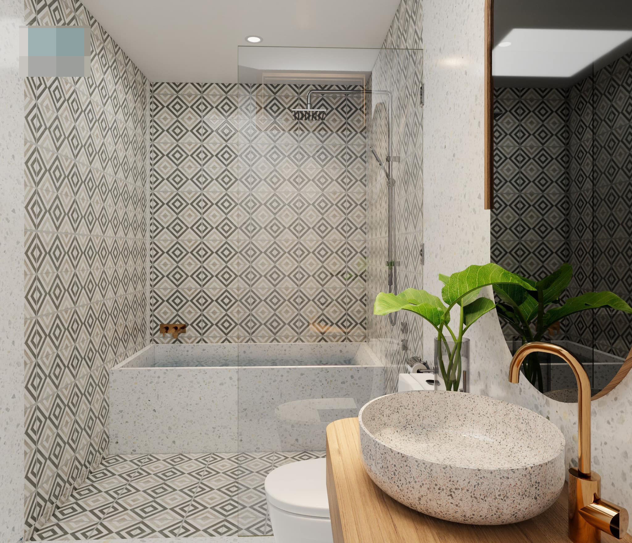 Phòng vệ sinh tầng 1, anh Hiển đưa bồn rửa mặt ra ngoài để mọi người thuận tiện sử dụng, phía trong là bồn cầu, khu tắm ướt kết hợp phòng xông hơi.