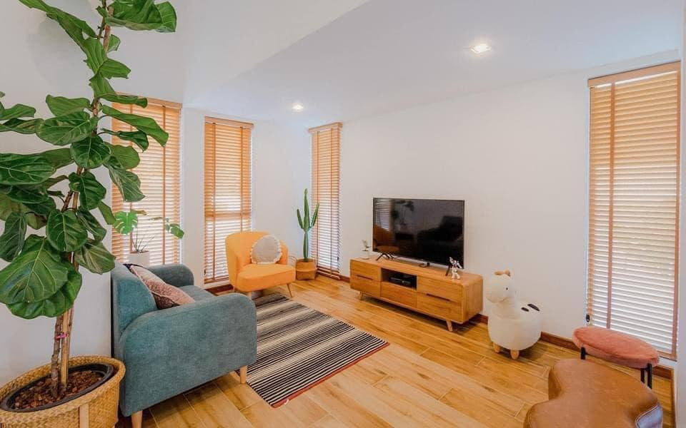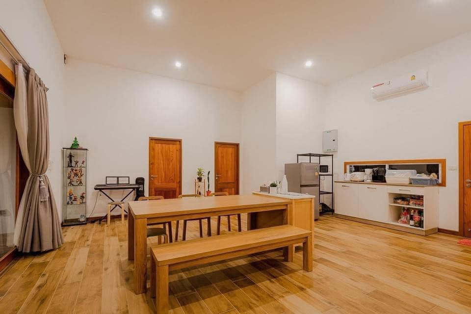 Hiên nhà vừa đủ để kê bộ bàn ghế ngoài trời, ngồi ngắm sao, hóng gió hoặc uống ly trà và cùng tận hưởng cảm giác bên nhau. Tầng lửng thành phòng ngủ phụ. Tất cả giường trong nhà đều sử dụng loại gỗ pallet gọn gàng, tiện dụng và chi phí rẻ.