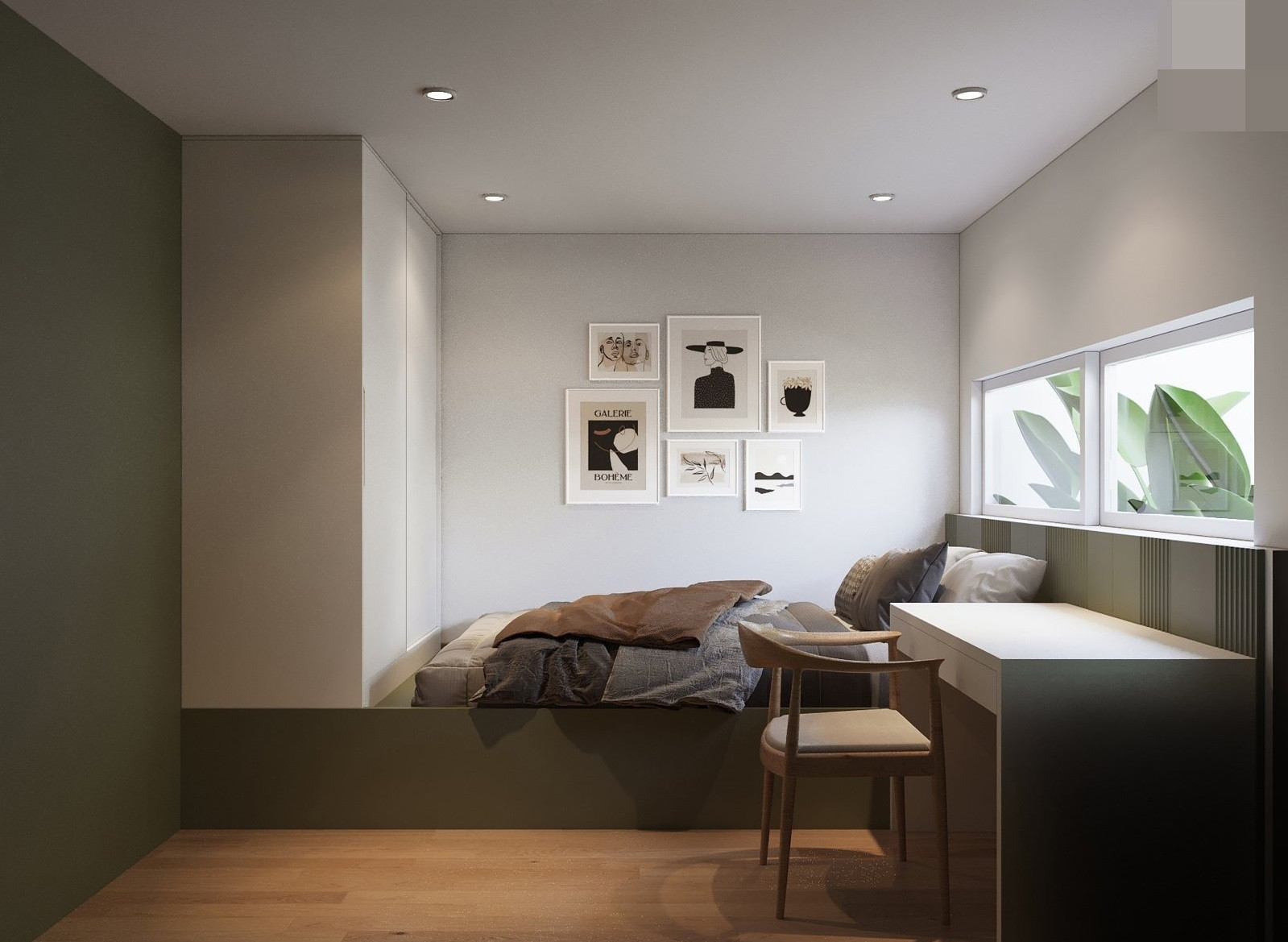 Tầng lửng khác biệt so với các thiết kế nhà cấp 4 với mảng giếng trời có mái kính và lớp bạt cản nắng khi cần không gian mát mẻ. Dưới giếng trời là bàn học, kệ sách, cây cảnh và ghế ngồi thư giãn thú vị. Phần giường ngủ dùng cửa kính hệ ray trượt, tạo độ mở cho phòng.