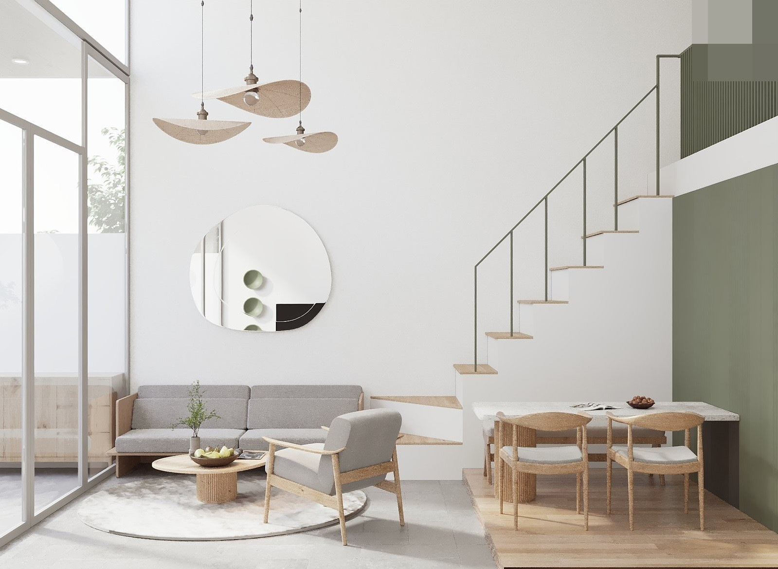 Không gian phòng khách, phía sau là bếp và phòng ngủ master. Kiến trúc sư Trương Hoàng Phúc cho biết, khi thi công, phần cầu thang sẽ được điều chỉnh để thuận tiện cho gia chủ sử dụng hơn.