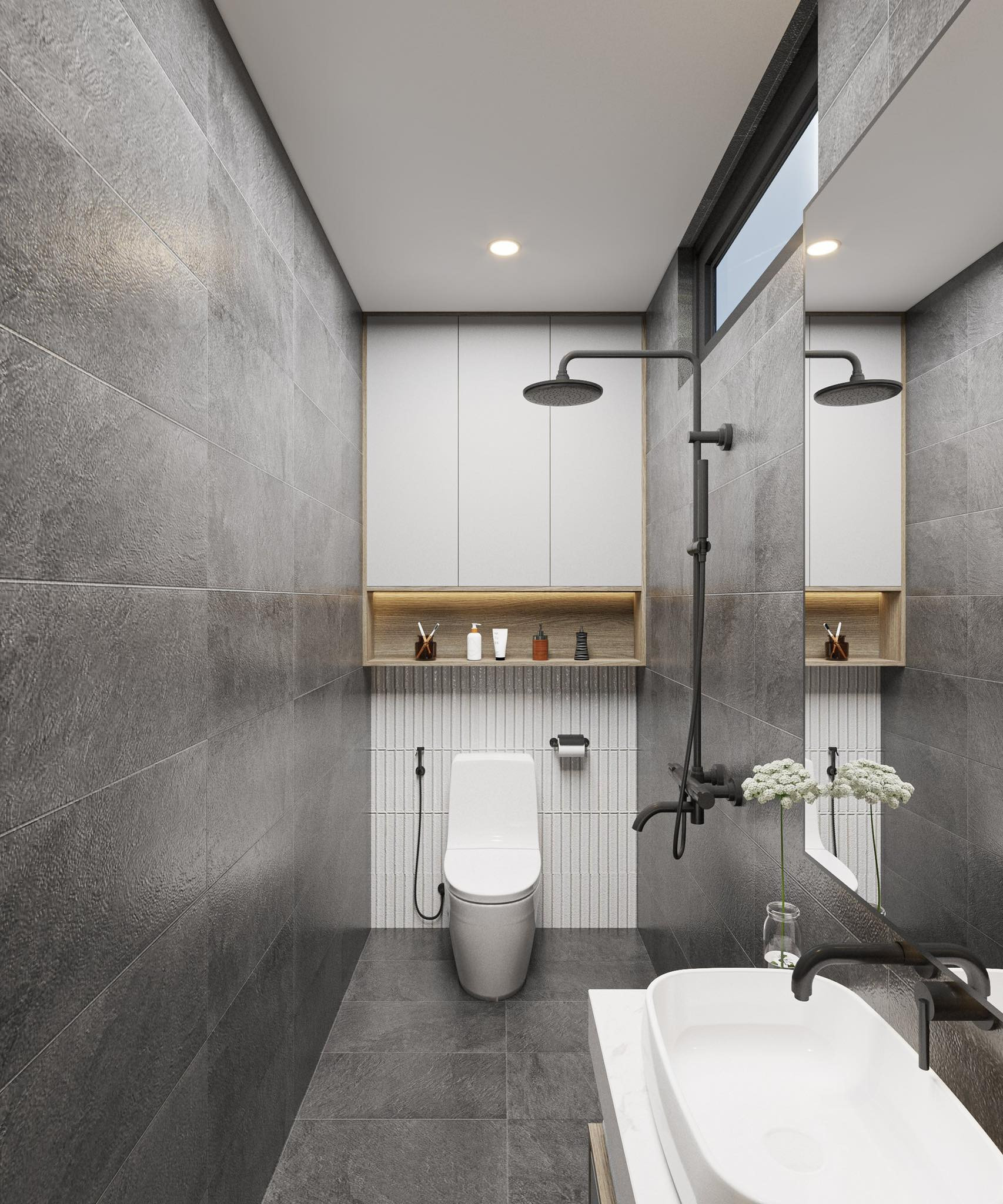 Phòng vệ sinh và khu giặt sấy tiện nghi. Gam màu xám, trắng giúp mở rộng diện tích và tăng tính thẩm mỹ cho không gian. Tủ âm tường sau bồn cầu là sự sáng tạo trong thiết kế, tận dụng góc chết thành nơi lưu trữ đồ hóa mỹ phẩm, giấy vệ sinh và đồ lặt vặt thật gọn gàng.