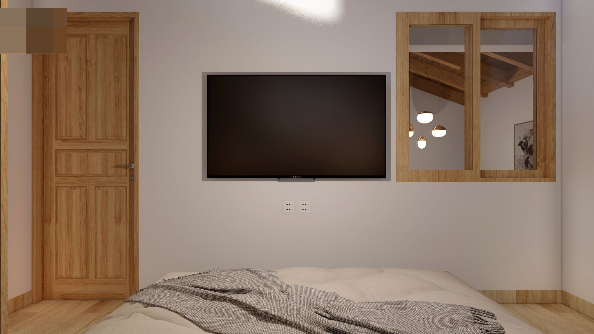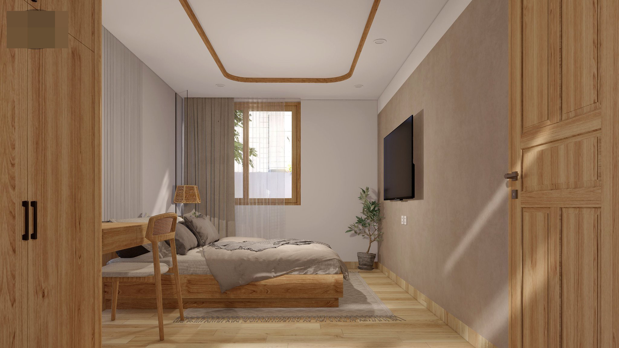Phòng ngủ master dùng hai màu vàng gỗ và trắng sáng hài hòa.
