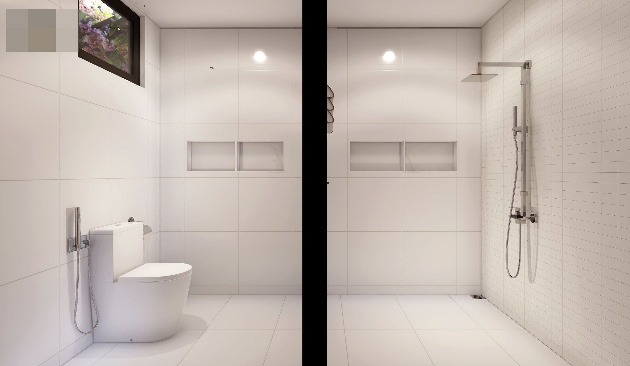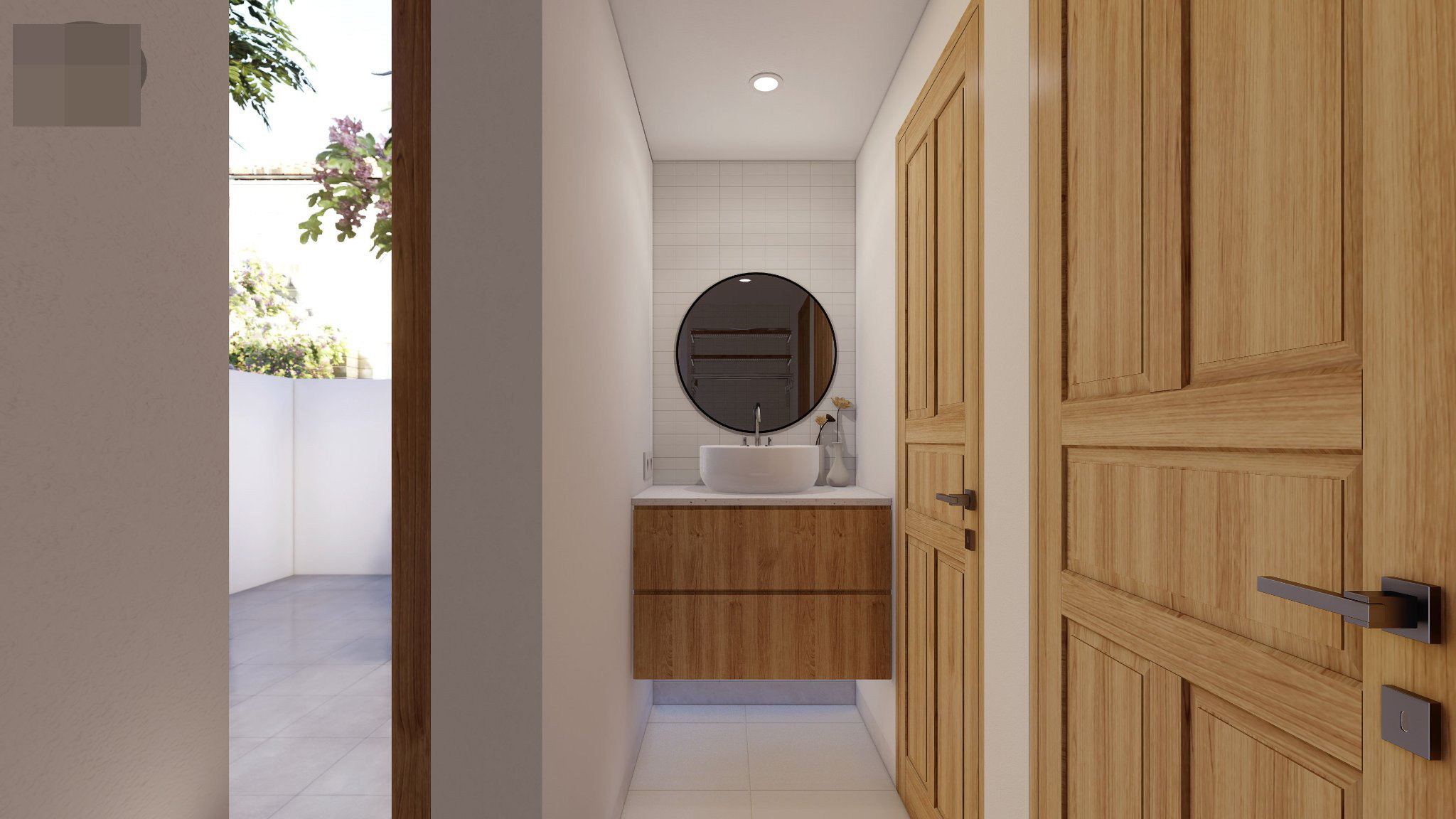 Phòng tắm, phòng giặt và bồn rửa bố trí ngay lối ra cửa phụ. Gia chủ đi làm về, có thể qua lối này vệ sinh cá nhân hoặc rửa tay chân sau khi làm vườn, tránh vấy bẩn ra phòng khách.