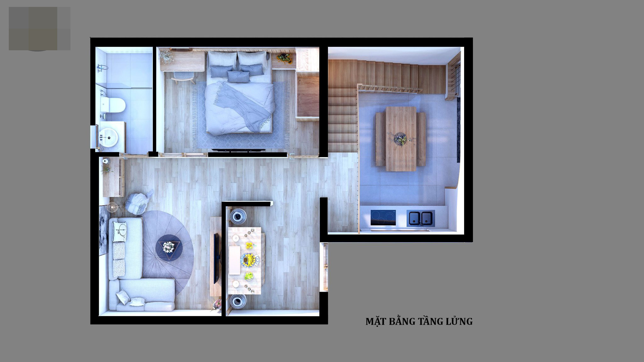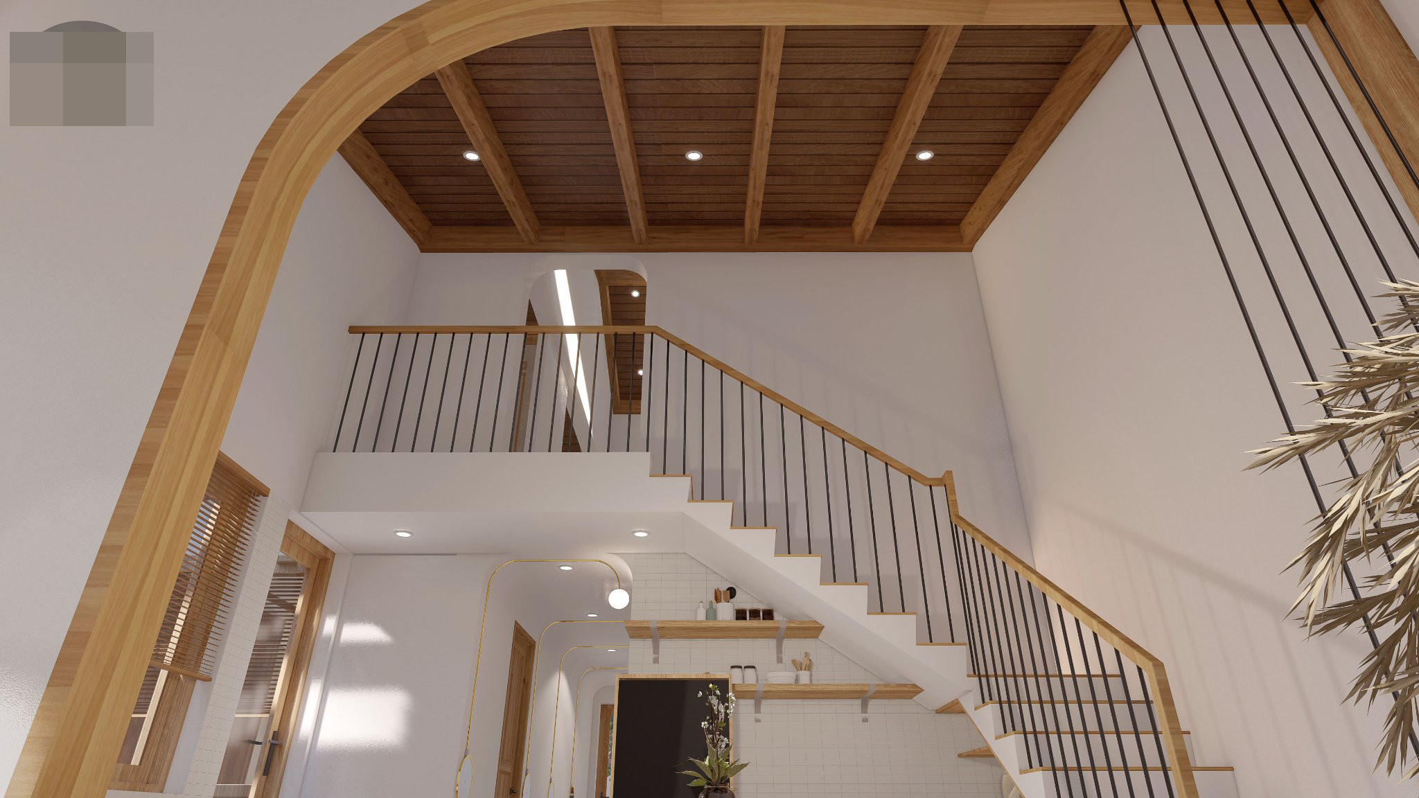 Cầu thang thanh thoát, phía dưới gầm tận dụng làm tủ bếp, tủ chứa đồ tiện dụng. Tuy nhiên, bếp nấu và bồn rửa đặt ở gần cửa sổ để khử mùi, thay vì dùng máy hút.