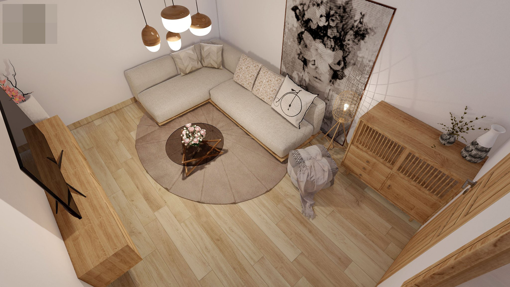 Phòng khách nhẹ nhàng, dùng lam gỗ và tranh tường tạo điểm nhấn trên nền sơn trắng. Ánh sáng bên khung cửa rộng tạo thành không gian thoáng đãng.