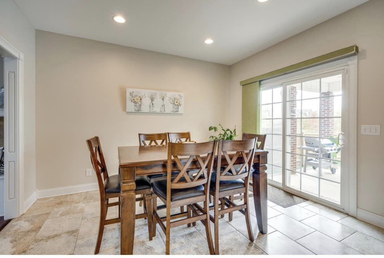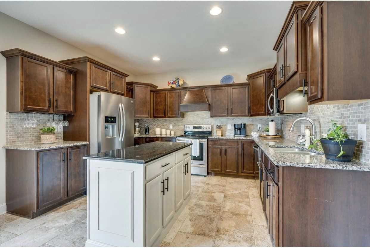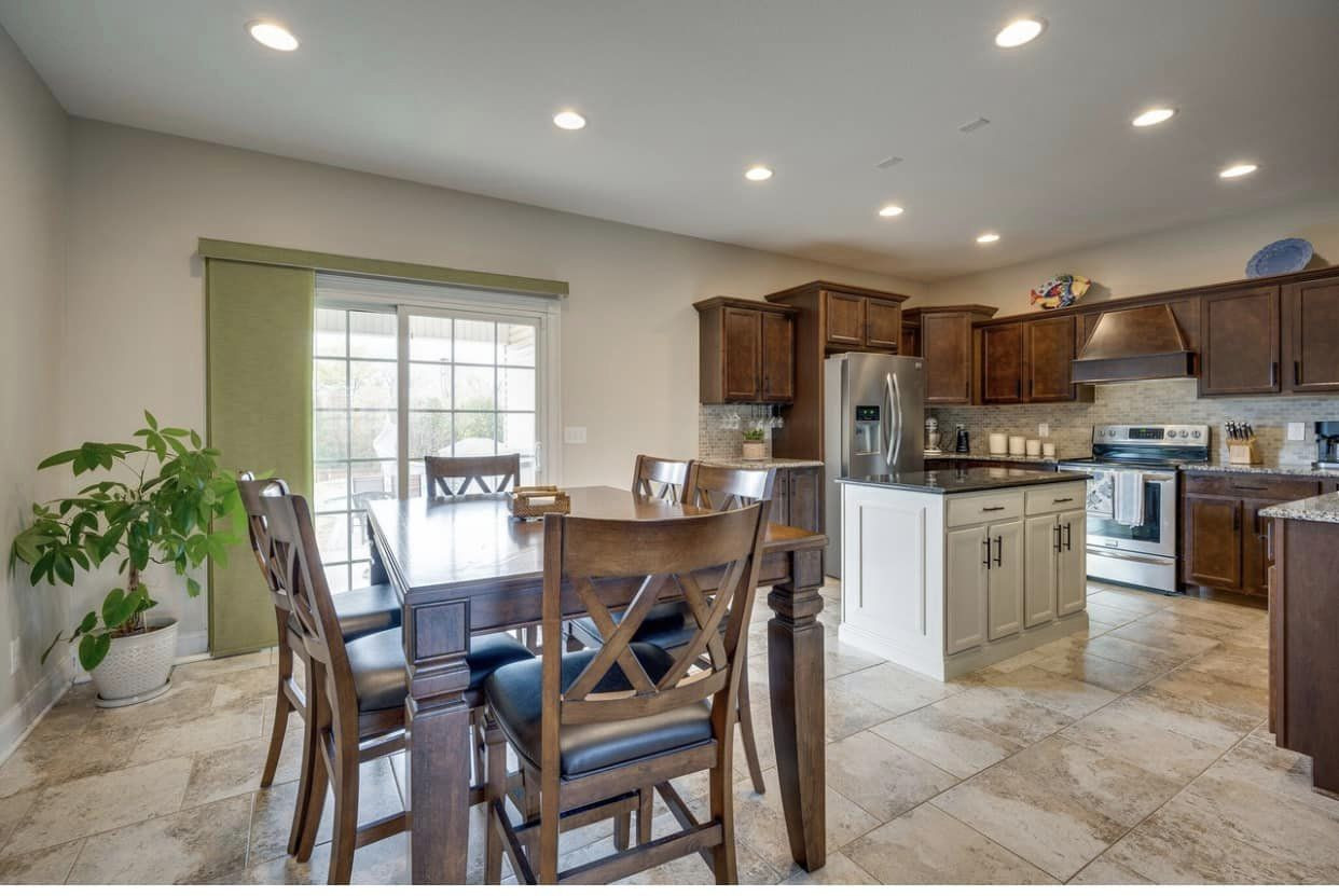 Bếp+ăn rộng rãi, tủ bếp và bàn ghế bằng gỗ thịt màu nâu nhạt nổi bật trên nền sơn sáng. Chiếc bàn đảo lớn giúp gia chủ tha hồ chế biến, bày biện món ăn yêu thích.