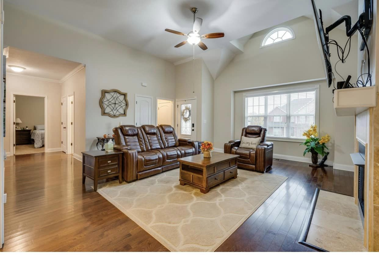 Phòng khách decor nhẹ nhàng, lò sưởi ấm cúng cho mùa đông lạnh giá và bộ ghế êm ái để cả nhà quây quần vào buổi tối.