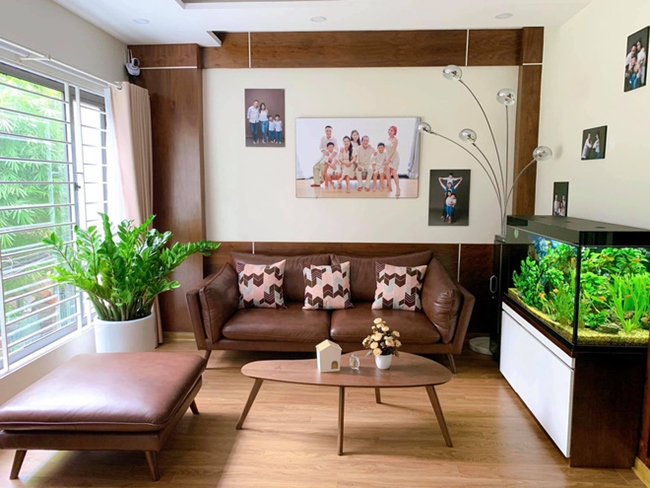 Trên trang cá nhân, MC 8X chia sẻ nhiều hình ảnh căn chung cư mới tậu. Phòng khách được trang trí nội thất hiện đại, đơn giản nhưng toát lên sự ấm cúng, sang trọng. Trên tường gắn những bức ảnh gia đình hạnh phúc, xung quanh là cây cảnh và một bể cá to. Hoàng Linh cho biết, đây là không gian mà cô yêu thích nhất. |