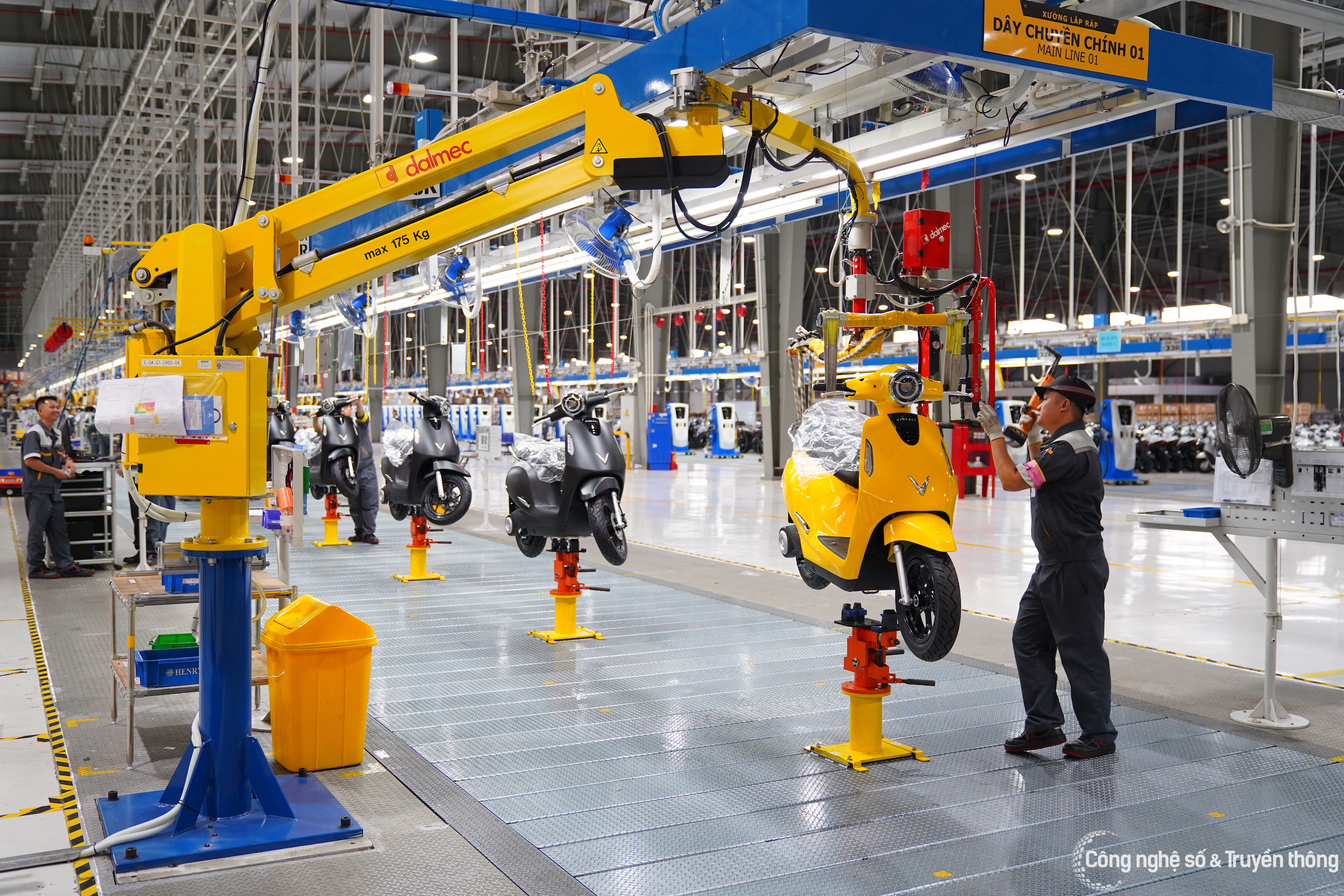 Dây chuyền lắp ráp xe máy điện VinFast nằm trong khu tổ hợp sản xuất ở Hải Phòng, là một trong những dây chuyền sản xuất hiện đại. Hàng trăm linh kiện thành phẩm khi đi vào lắp ráp sẽ kết nối qua các bước và chỉ mất hơn 40 phút để hoàn thiện một sản phẩm xe máy điện.