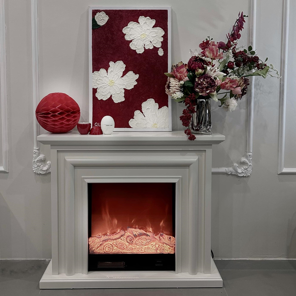 Chốn lui về mới của gia đình Quỳnh Lương được thiết kế theo phong cách bán minimal (tối giản) kết hợp Indochine (Đông Dương). Tầng 1 được thiết kế dạng mở, nối liền phòng khách, phòng ăn và nhà bếp. Điểm nhấn của căn phòng là lò sưởi trang trí mang phong cách Đông Dương, tạo cảm giác ấm áp và sang trọng.