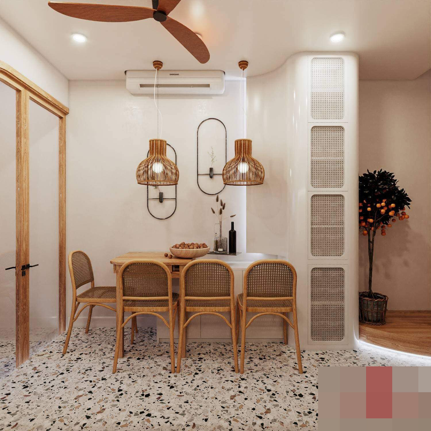 Vì gia đình có bé trai rất hiếu động, vậy nên việc bo tròn các góc và vật dụng vừa là điểm nhấn cho phong cách riêng của anh mà còn có độ an toàn nhất định cho con. Ngoài ra, khu vực sân thượng cũng là nơi để gia chủ có thể thư giãn sau một ngày dài căng thẳng. Dù nhỏ nhưng vẫn bố trí đủ không gian và kết hợp với những mảng xanh.