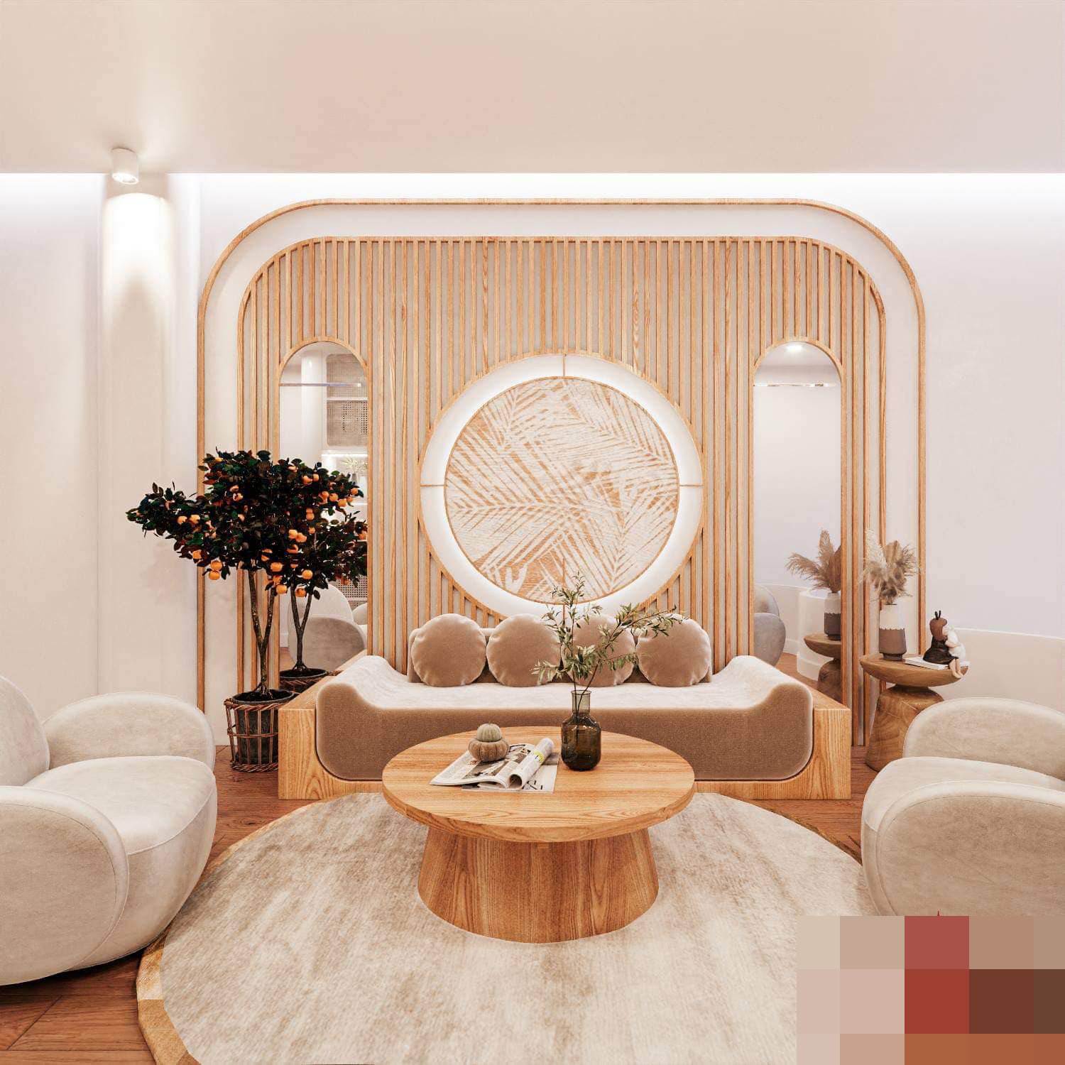 Phòng khách tối giản được chuyển lên tầng 2. Màu trắng và nâu gỗ sáng cho không gian nhà đẹp mở rộng hơn.