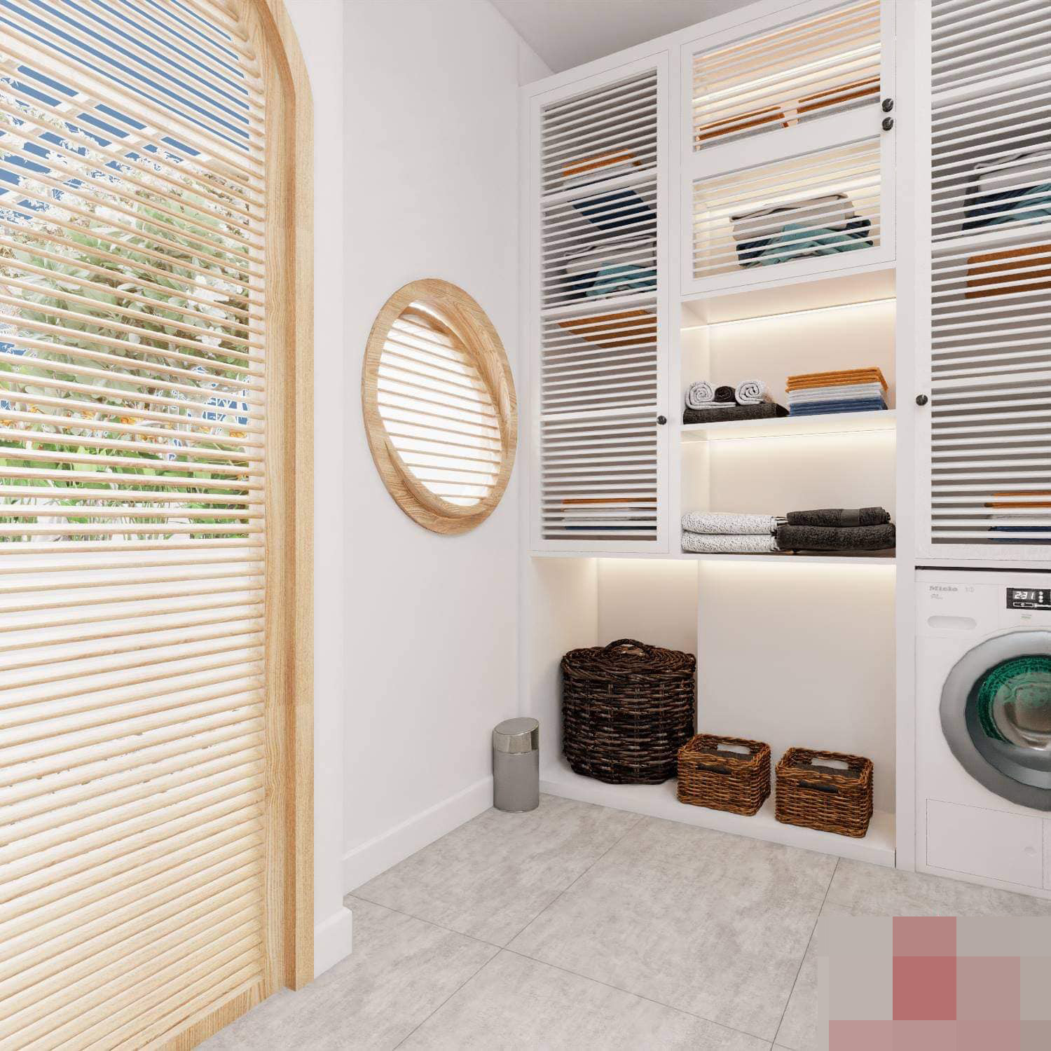 Phòng giặt đồ tiện nghi, ngăn nắp, nằm trên tầng cao nhất. Khu vực này có một giếng trời giúp việc hong khô quần áo nhanh chóng hơn. Cửa dẫn ra vườn “địa đàng” nhiều ánh sáng dùng loại giống lam gỗ, cho phòng luôn thoáng khí.