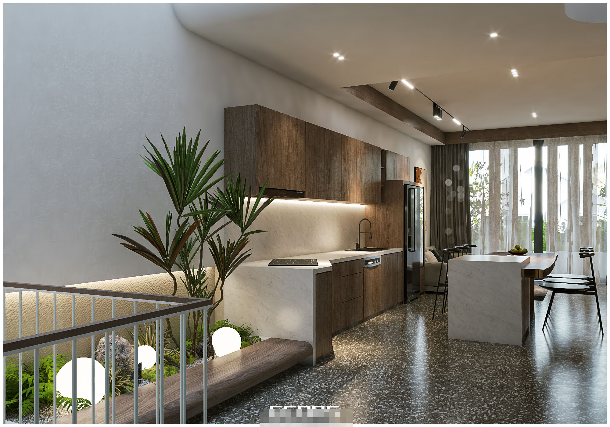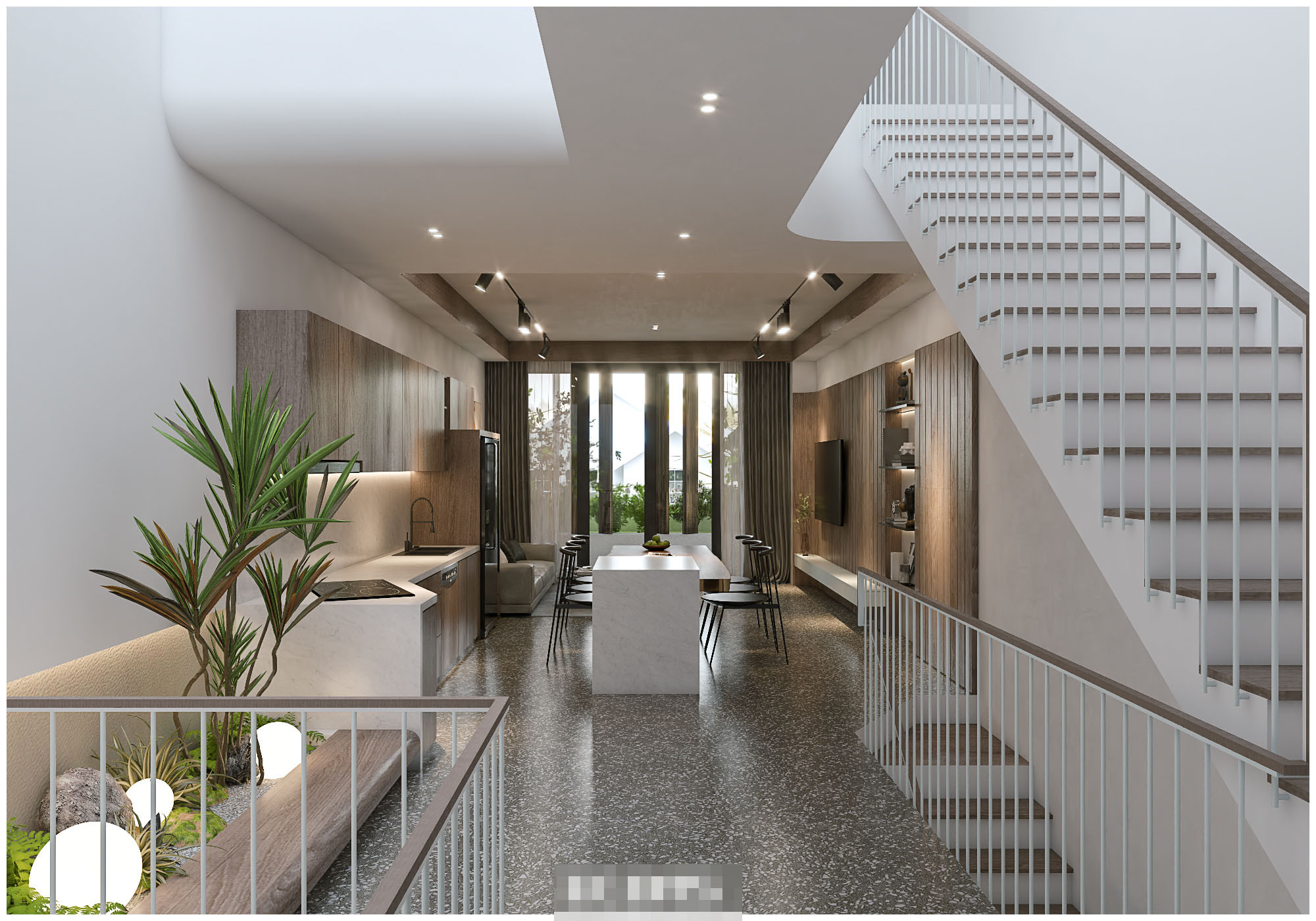 Bếp và bàn ăn, phòng khách thiết kế liên thông nhau kiểu chung cư. Cây thần tài núi được sử dụng để mang đến sự sinh động khắp không gian. Sàn nhà ốp đá mài.