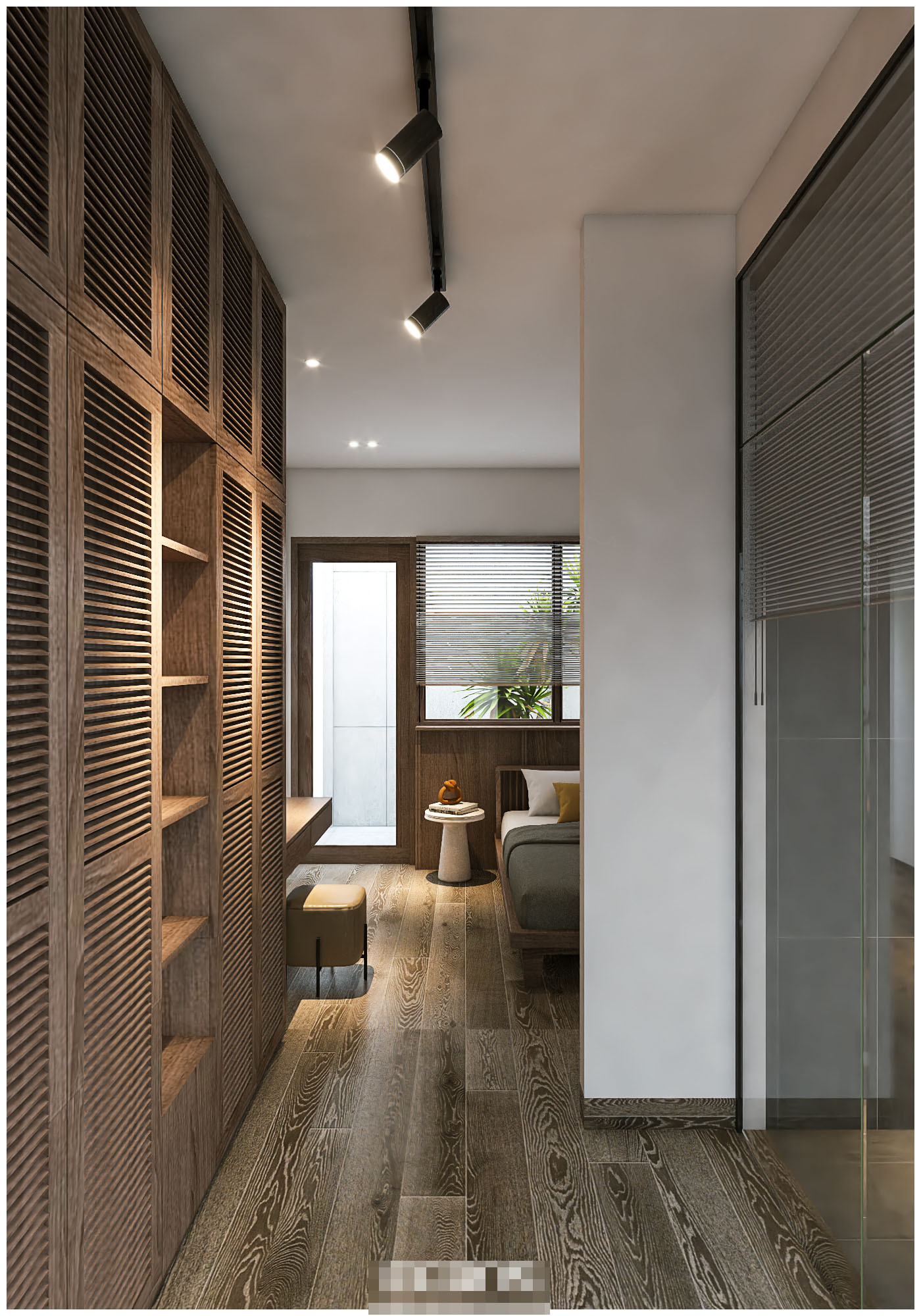 Phòng ngủ có cửa ban công hướng ra giếng trời nên vừa có nhiều ánh sáng, khí tươi lại xử lý được các yếu tố khí hậu mát mẻ bên trong.