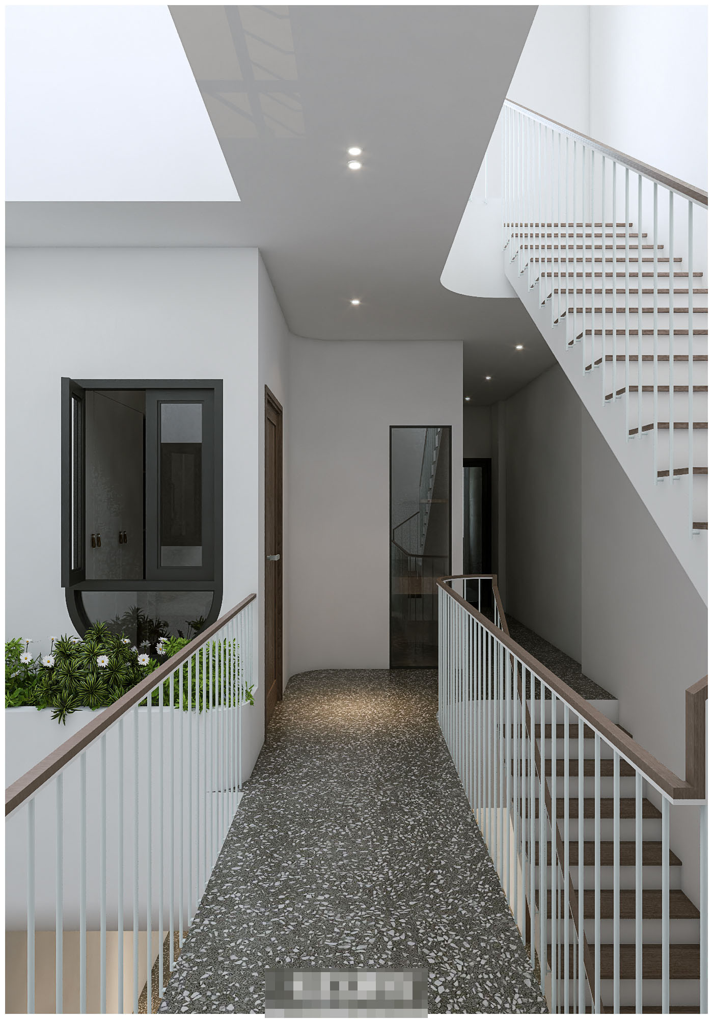 Những mảng tường nhám giúp tiêu âm khi hút gió từ giếng trời xuống, đồng thời tạo hiệu ứng đặc biệt cho thị giác. Ở đây còn có 1 phòng kho đựng đồ đạc ít dùng của gia chủ.