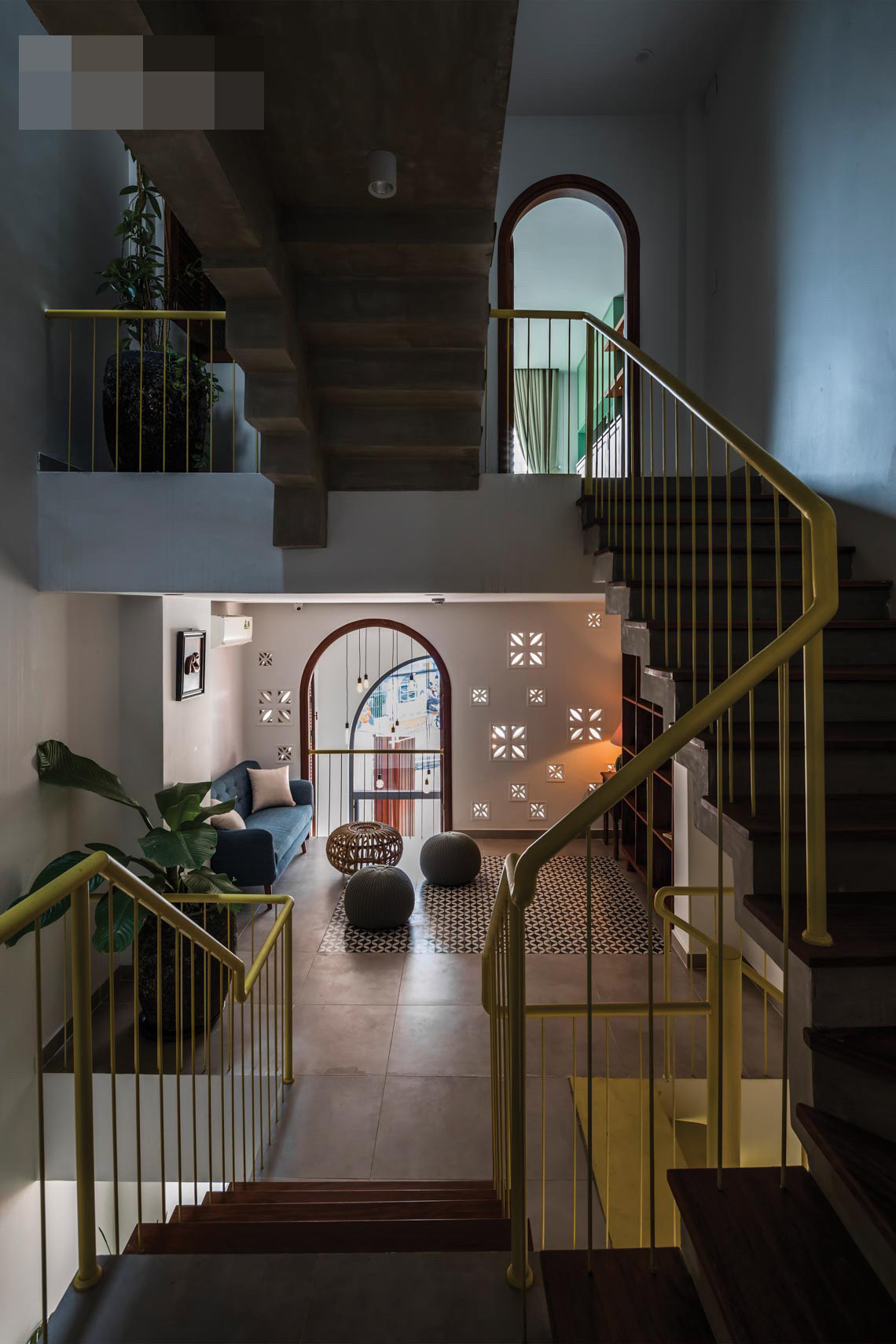 Mặc dù được xây dựng nhiều tầng trên diện tích đất nhỏ nhưng nhà không có cảm giác chênh vênh vì các kiến trúc sư đã tinh tế thay đổi mảng khối mặt tiền mỗi hai tầng lầu để tạo hiệu ứng thị giác, giúp ngôi nhà trông không quá cao so với thực tế vốn có.