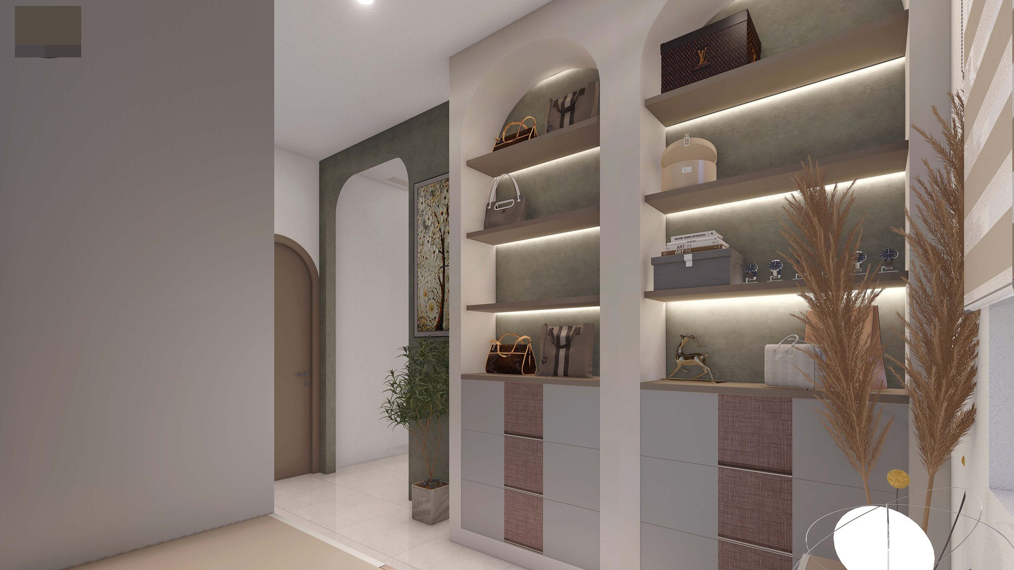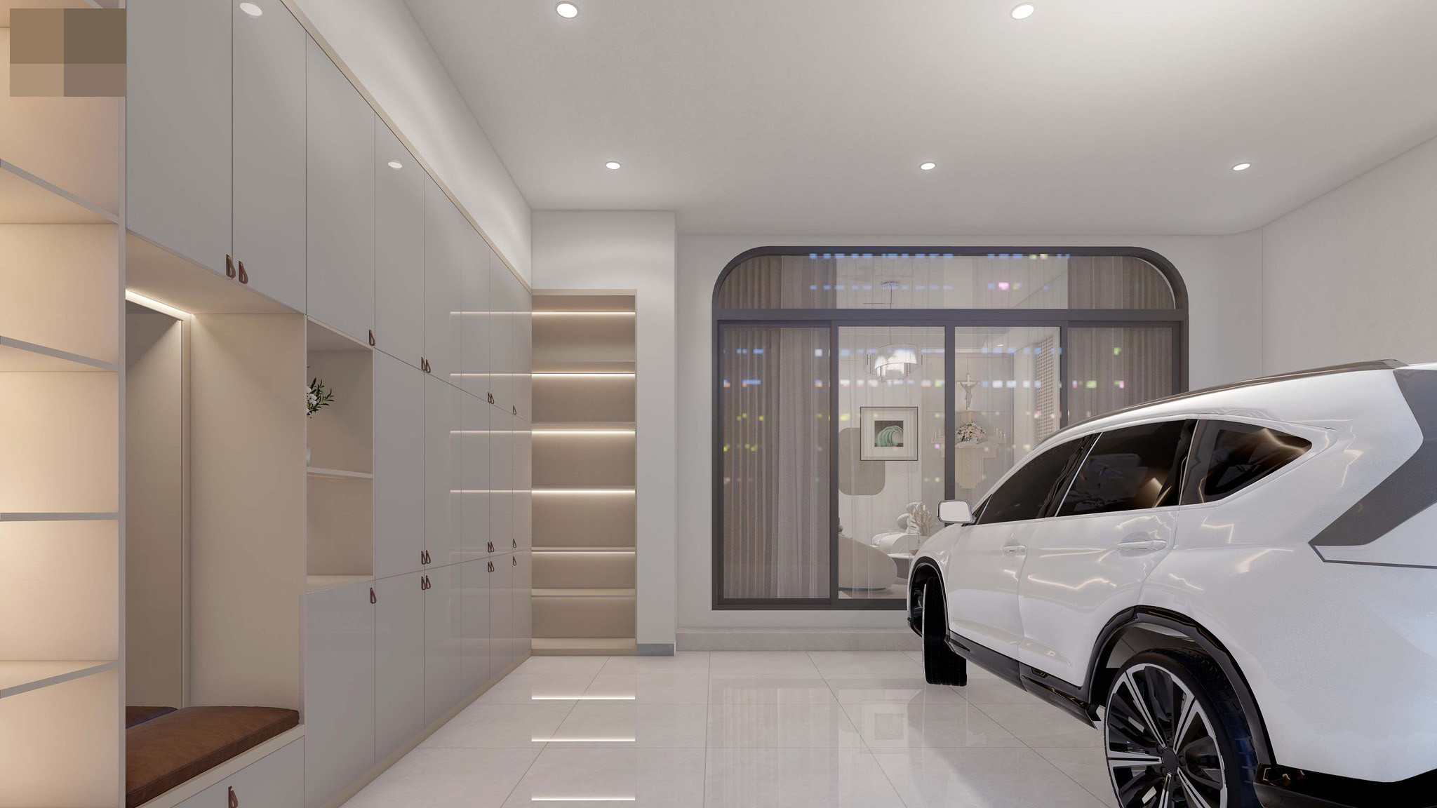 Sau cánh cổng, kiến trúc sư tạo một khoảng lùi ở tầng 1 làm chỗ đậu xe đồng thời lắp tủ cao kịch trần để đựng giầy, các vật dụng hay sử dụng... Khoảng lùi còn là bước đệm tránh nóng cho phòng khách và các không gian tiếp nối.