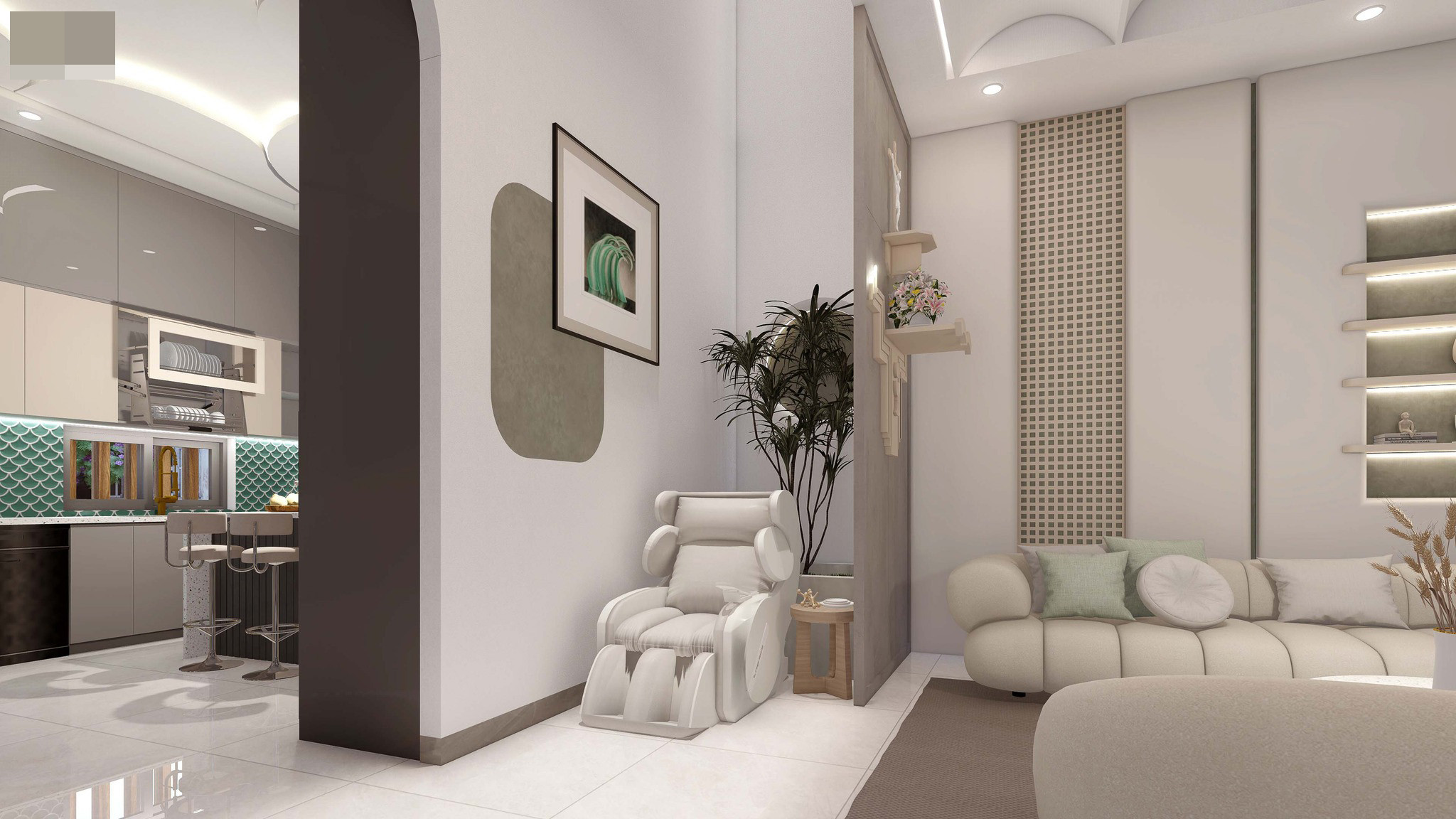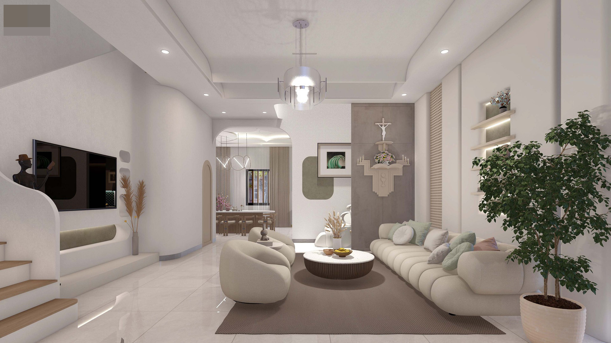 Phòng khách dùng tone trắng sữa làm chủ đạo. Bộ sofa lấy ý tưởng từ những cục kẹo bông. Bàn trà hình tròn rộng cho gia chủ thoải mái đặt đồ uống, đồ điểm tâm nhẹ khi có khách. Ánh sáng đèn điện kết hợp ánh sáng tự nhiên tạo ra độ sáng vừa phải, không bị chói.