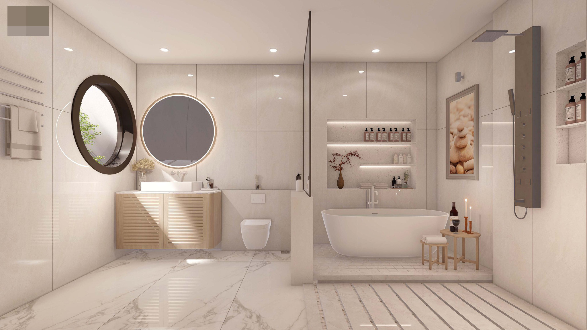 Phòng tắm master được dành một diện tích lớn, đủ để tạo thành hai khoang ướt và khô, lắp bồn tắm ngâm thư giãn.