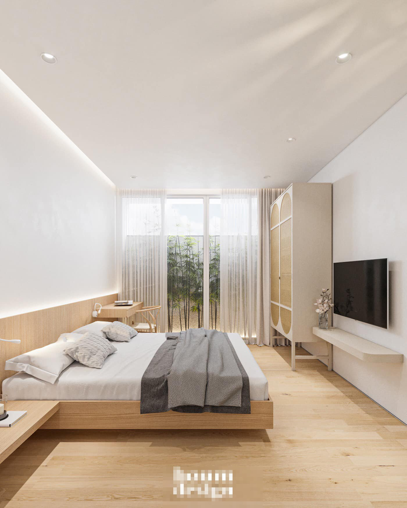 Phòng ngủ cho người lớn tuổi ở tầng 1, trước và sau đều có khoảng hút gió, thoáng đãng.