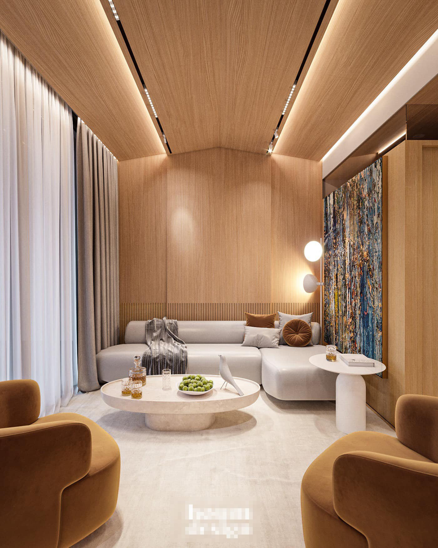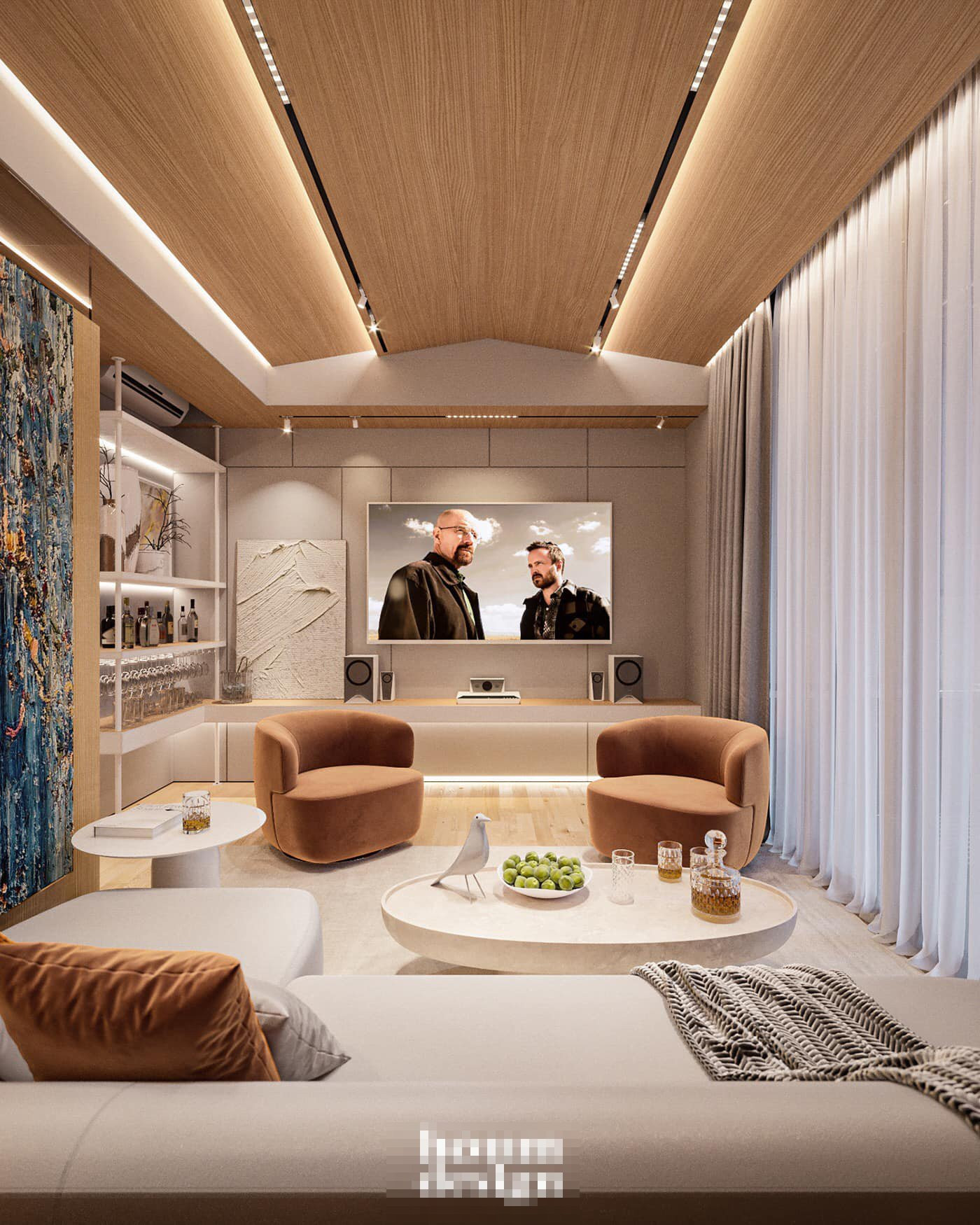 Phòng giải trí với trần nhà lắp đèn ray, âm thanh vòm, tạo cảm giác như xem trong rạp chiếu phim.