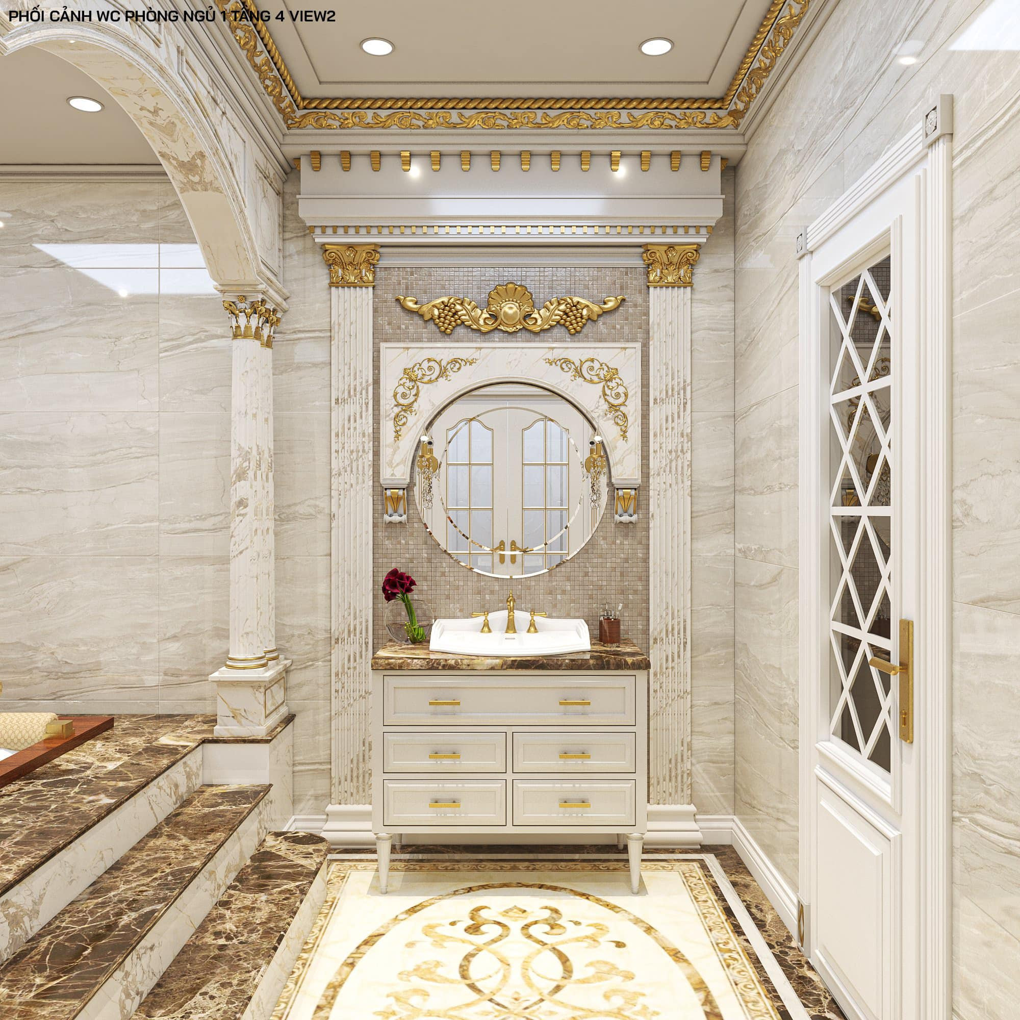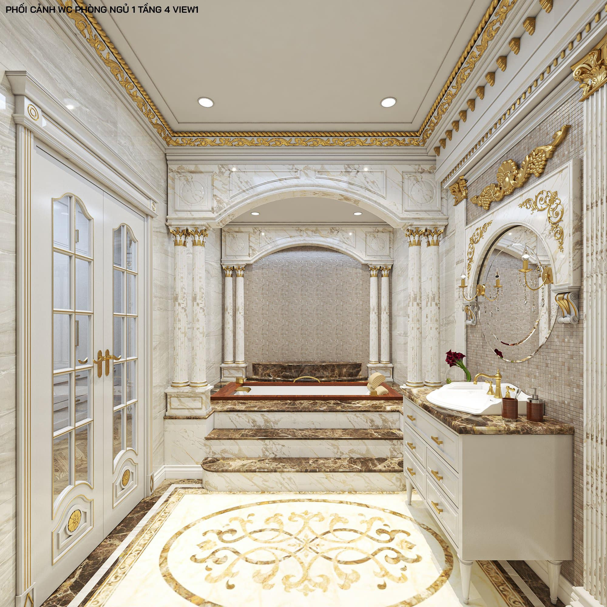 Phòng tắm trong phòng ngủ master với hệ thống bồn tắm sục thủy lực, mát-xa hiện đại. Bồn tắm được xây cao hơn khu vực rửa mặt để tạo sự riêng biệt.