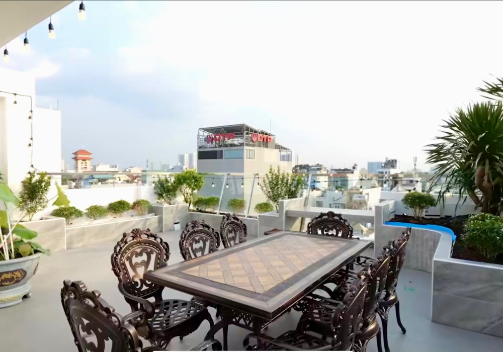 Khuôn viên sân thượng thoáng đãng là nơi vợ chồng nghệ sĩ thường lên ngắm cảnh, suy nghĩ kịch bản. Anh đặt một bộ bàn ăn ngoài trời, cho trồng các loại cây cảnh để thêm mảng xanh vào không gian sống.