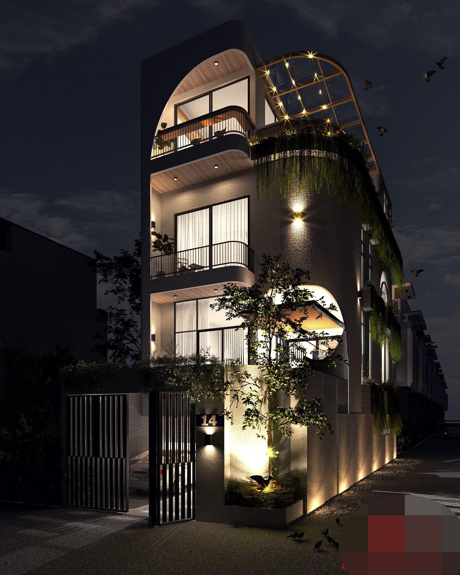 Kiến trúc độc đáo của công trình. Tầng 1 là gara ô tô, sân cổng.