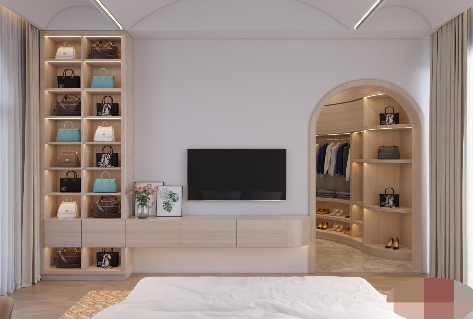Phòng ngủ master tiện nghi, kệ trưng bày túi hàng hiệu và phòng thay đồ sang trọng.