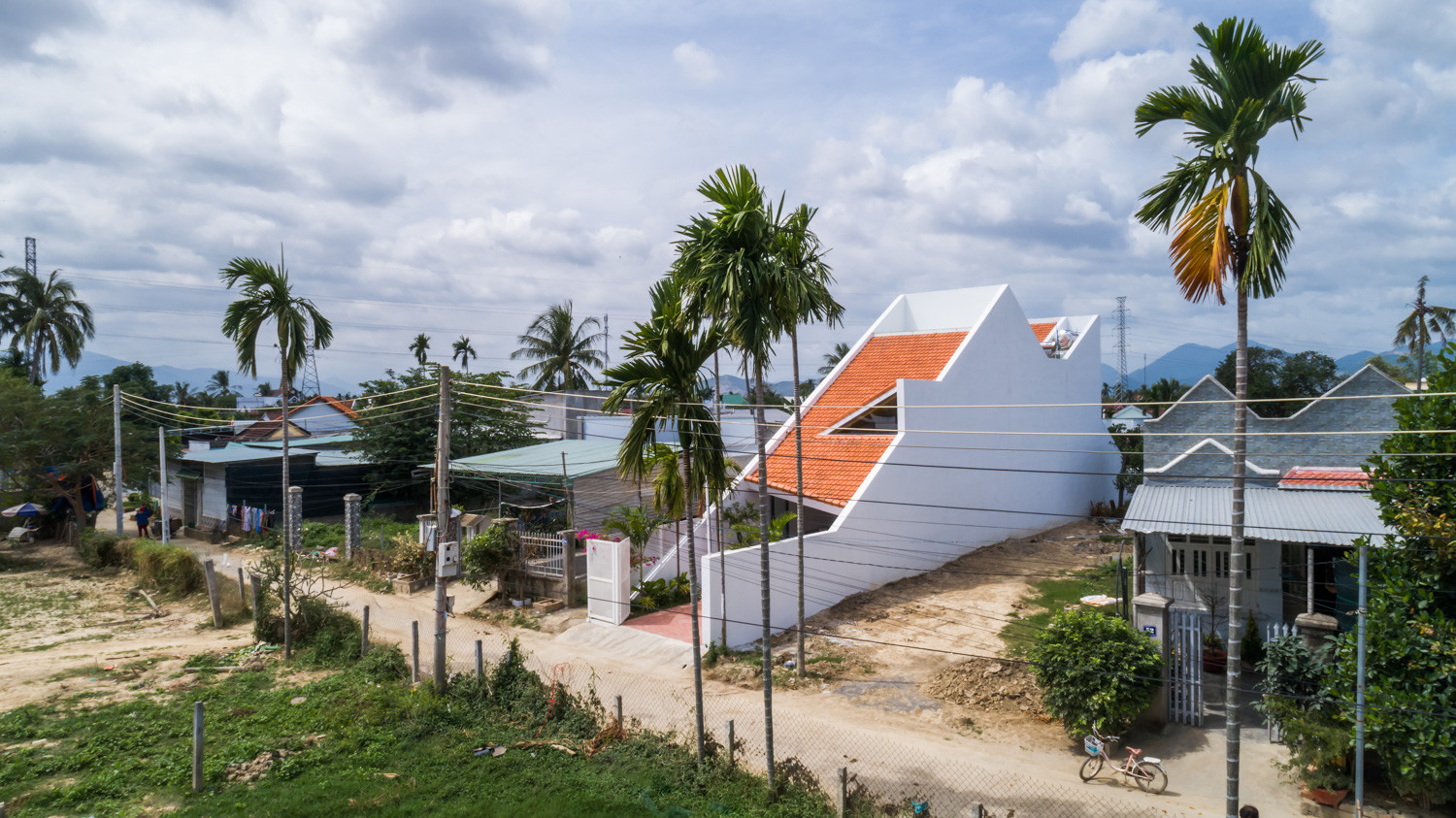 Mái ngói đỏ với độ dốc lớn giảm bớt sự vuông vức của ngôi nhà. Ngôi nhà đậm chất nông thôn thông qua sân trước và sân sau được lát bằng gạch nung, thể hiện rõ đặc trưng kiến trúc bản địa.