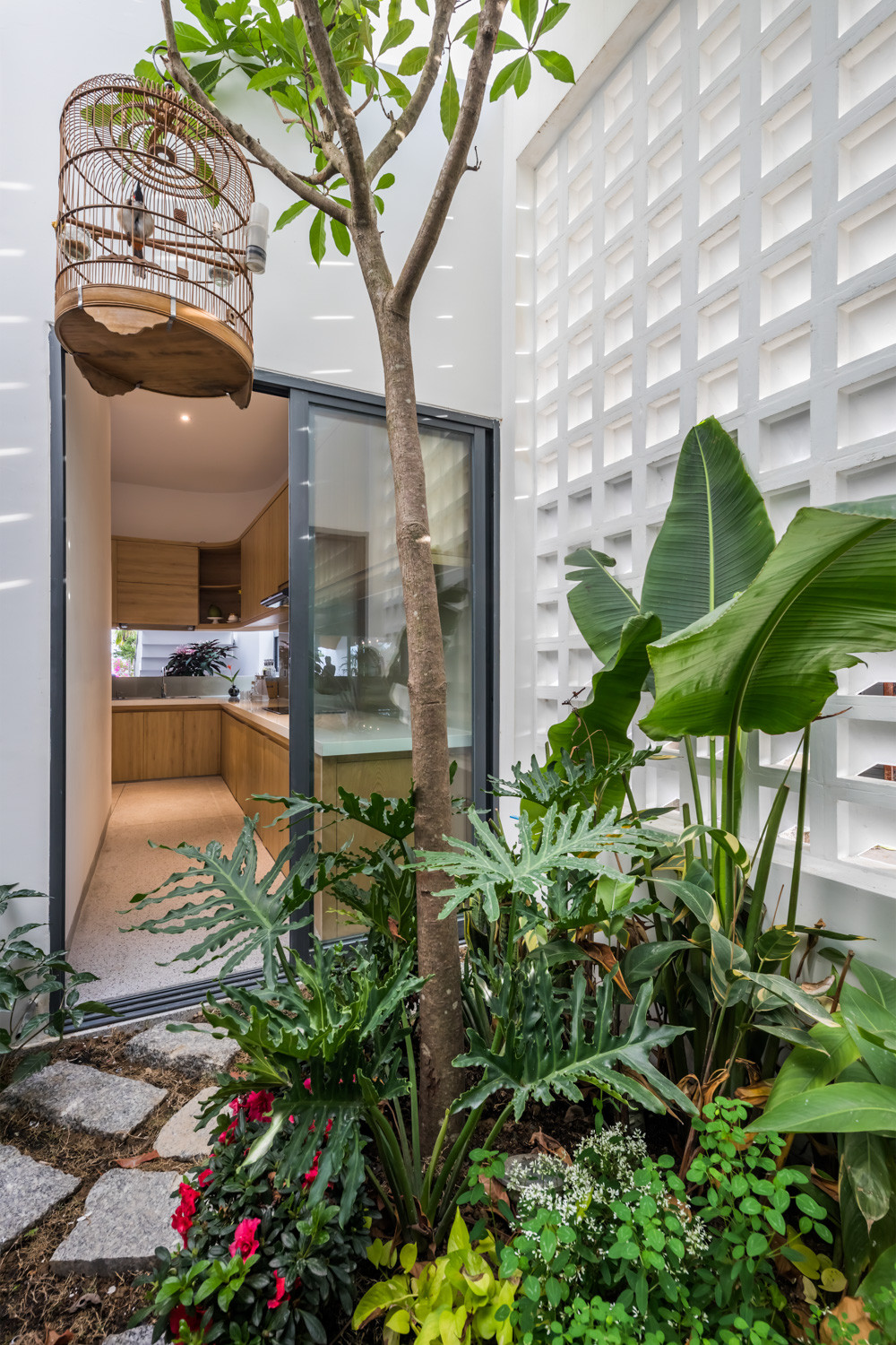 Các không gian sinh hoạt và nghỉ ngơi được ngăn chia bởi khoảng thông tầng và giếng trời giữa nhà. Qua những khoảng không này, ánh sáng và gió được dẫn dắt vào công trình một cách tự nhiên, mang đến sự thông thoáng, mát mẻ cho nhà.