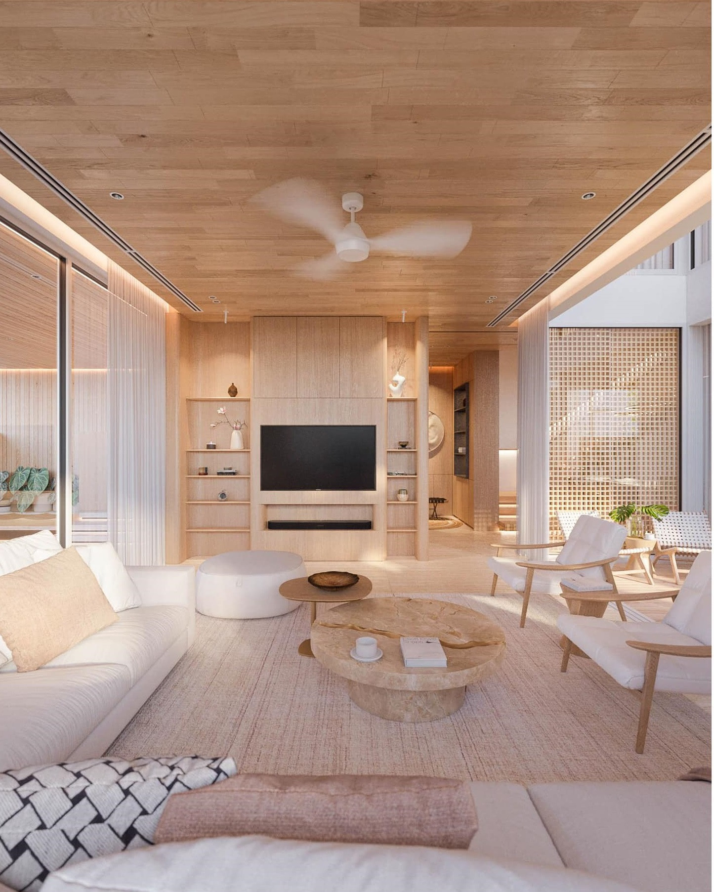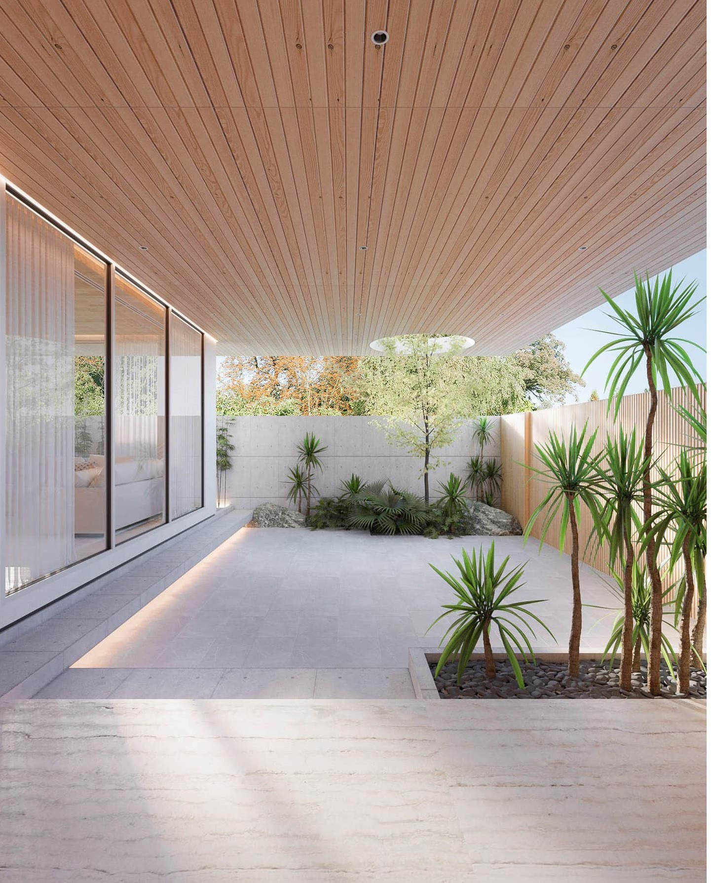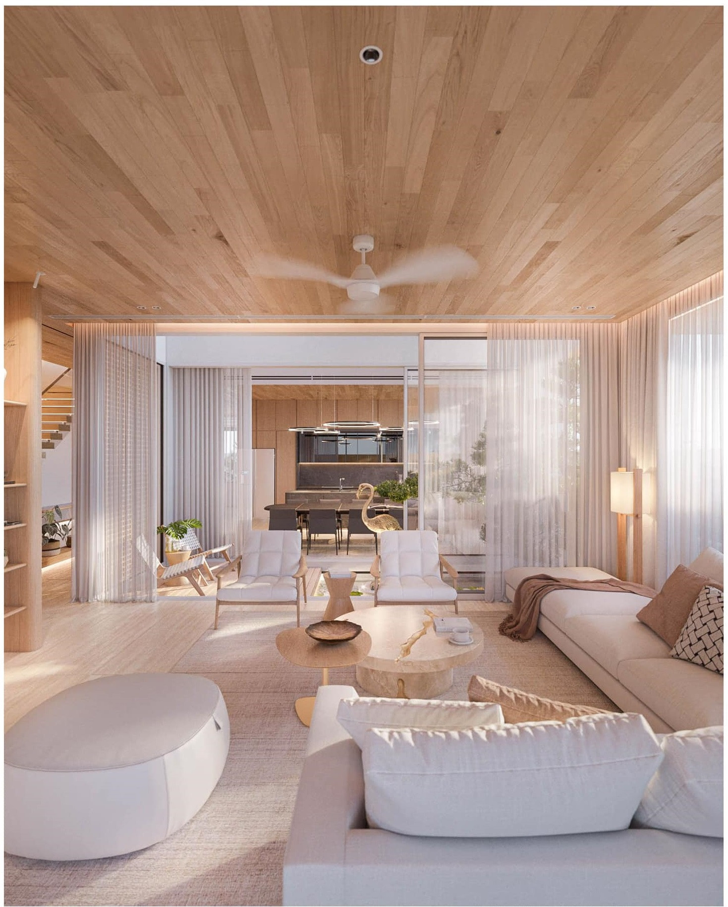 Lối giao thông, kết nối các khu vực chung và riêng. Từ trần nhà, sàn gỗ và tường đều ốp gỗ công nghiệp chống ẩm.