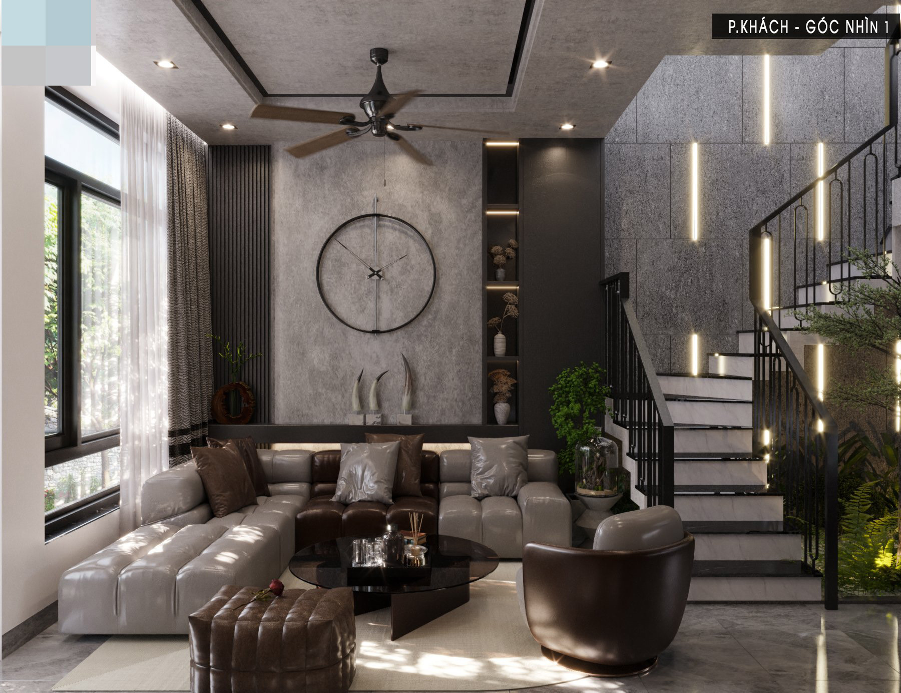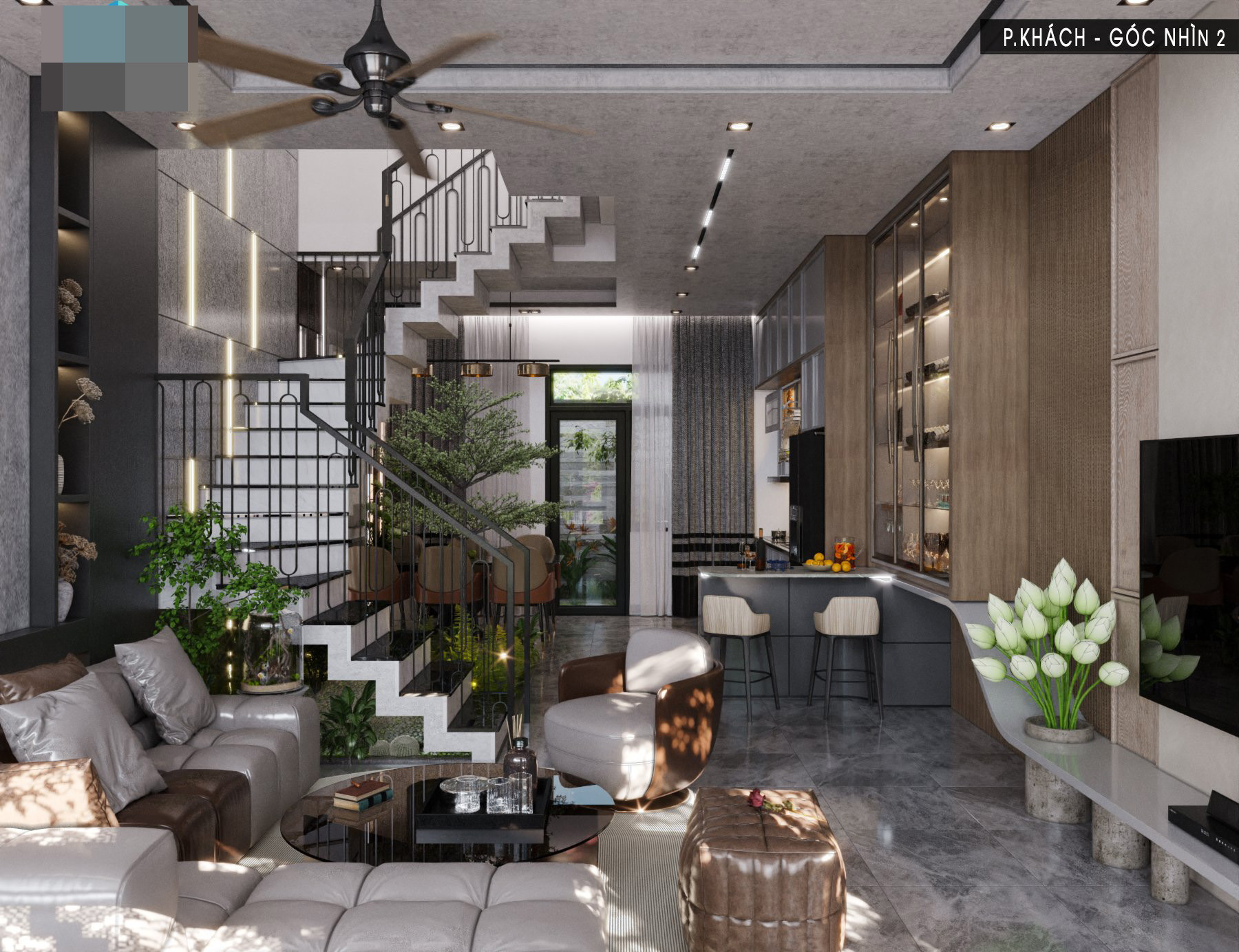 Sự kết hợp giữa sơn giả bê-tông, sơn trắng và nội thất màu be, màu nâu trầm mang đến không gian sang trọng, gần gũi. Cầu thang ở vị trí trung tâm nhưng không làm nhà bị bí nhờ lan can sắt mỏng. Đây cũng là cách để phân biệt không gian bếp và khách.