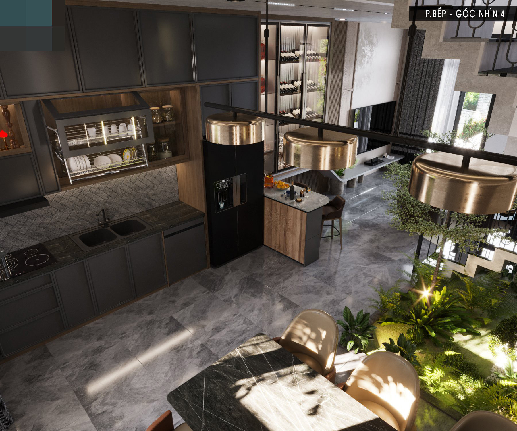 Sàn nhà lát đá vân màu xám đẹp mắt, hài hòa với tủ bếp và mảng tường bếp lát xương cá. Đèn thả trần tinh tế, đơn giản.