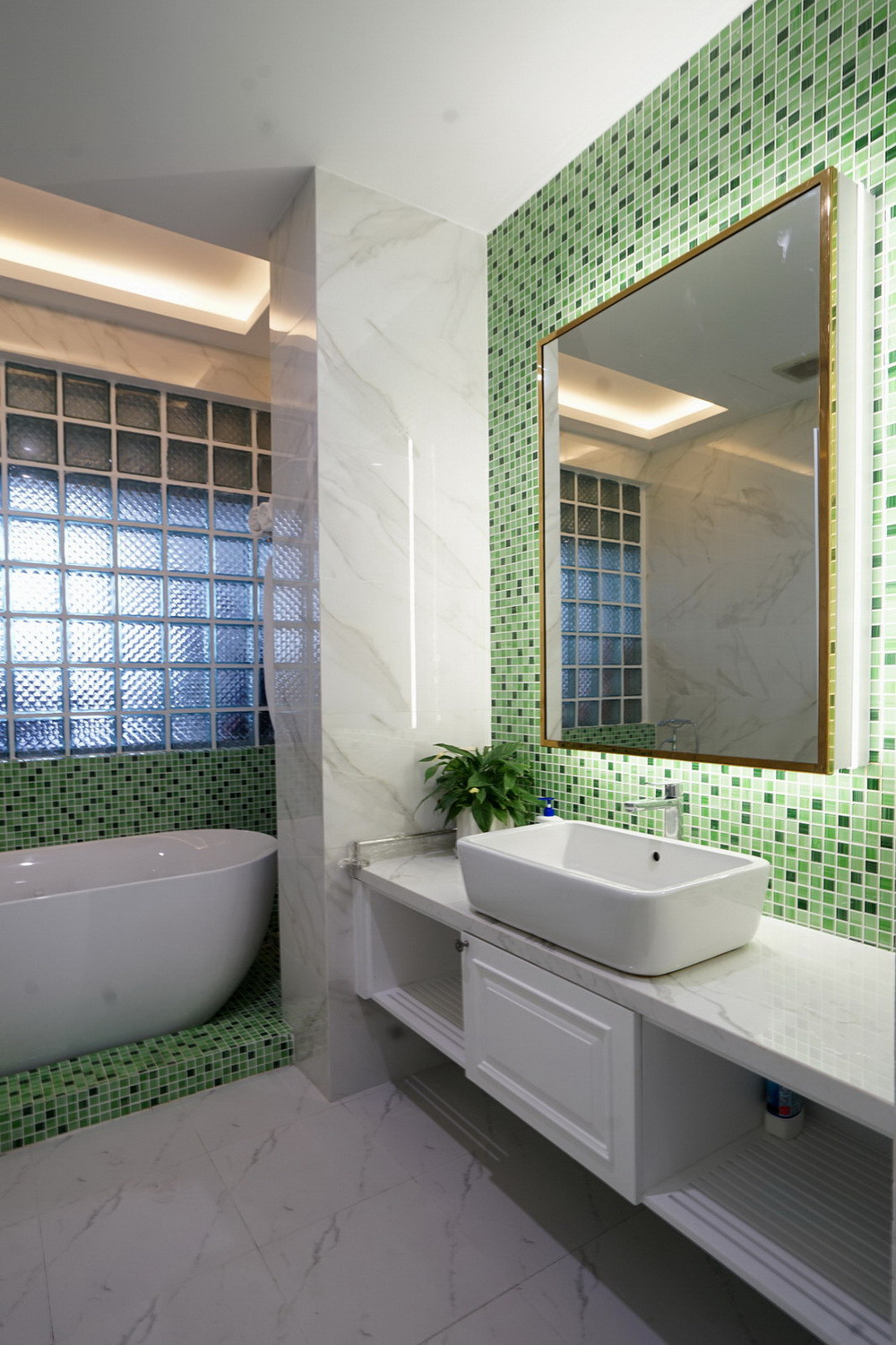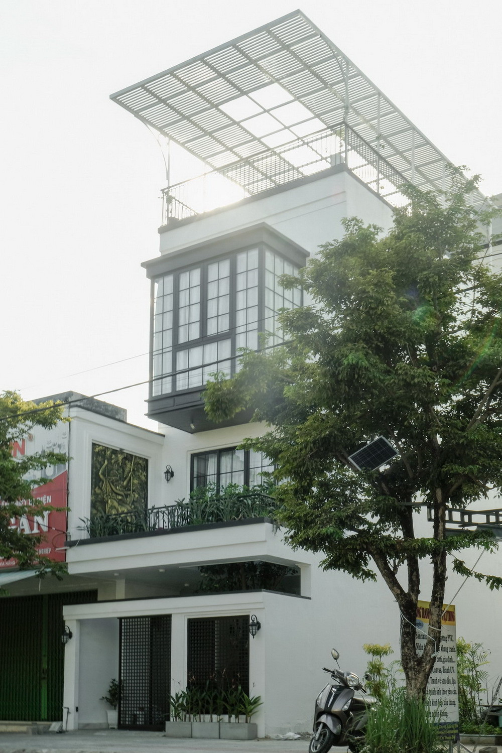 Giải pháp của kiến trúc sư là sử dụng gạch kính để giảm ánh nắng hướng Tây chiếu trực tiếp vào nhà, kết hợp với giếng trời khu đệm để giảm nhiệt, thông gió theo phương thẳng đứng, đồng thời tạo cảnh quan cho tầng 1 và 2.