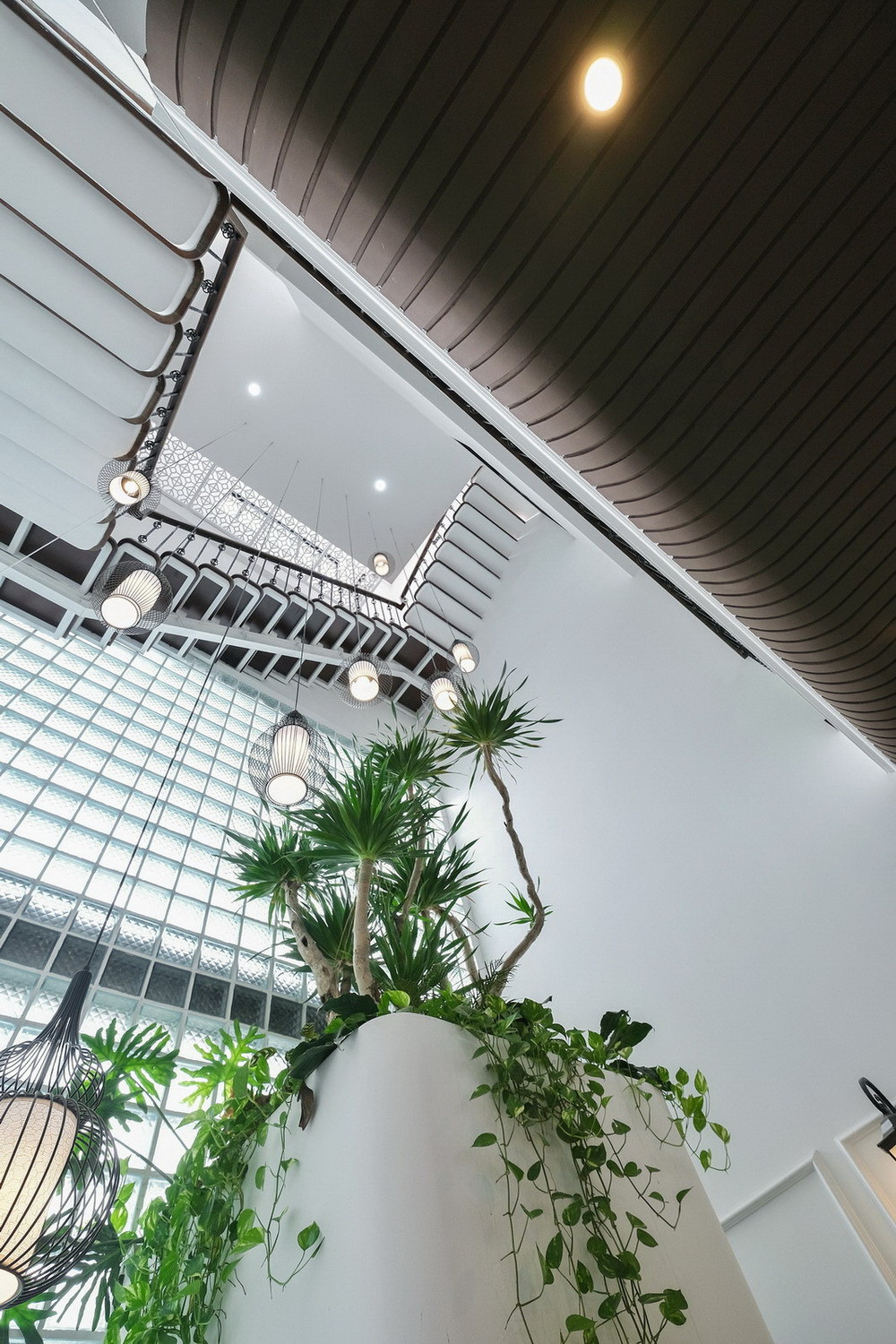 Khoảng không gian giếng trời trồng cây xanh, tạo điều kiện thông gió theo chiều dọc, cung cấp ánh sáng tự nhiên cho phòng ngủ.