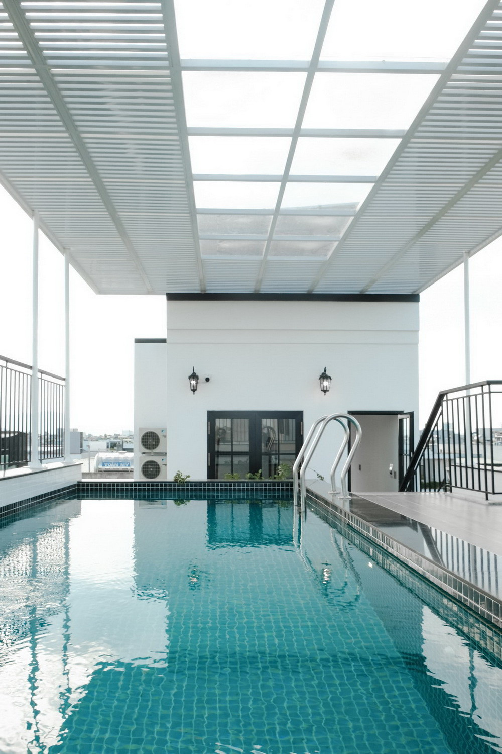 Bể bơi được bố trí trên mái nhằm mục đích thư giãn lúc rảnh rỗi, đồng thời giúp giảm nhiệt và làm mát không gian bên dưới. Từ đó, ngôi nhà được điều hòa, cung cấp không khí trong lành và mát mẻ trong khí hậu nhiệt đới gió mùa.