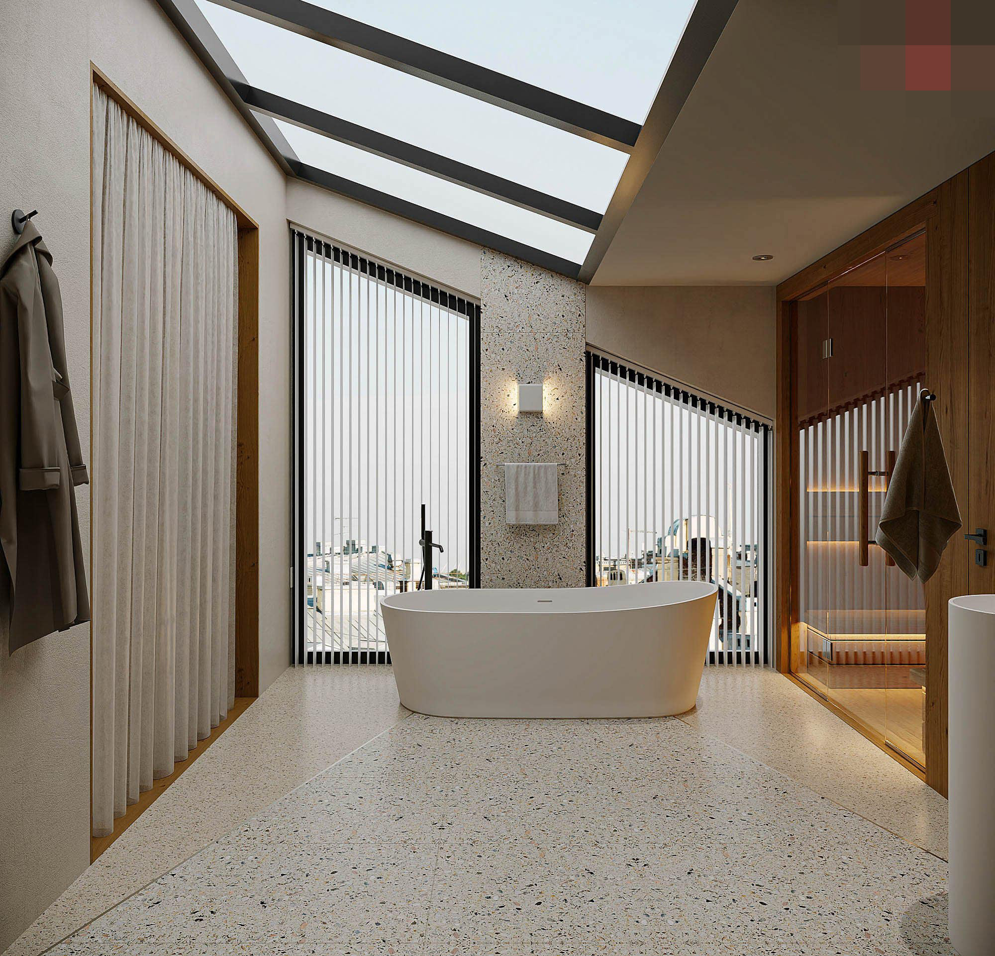 Cuối cùng, khu vực tầng gác mái được biến thành một nơi chill trong nhà với phòng tắm, phòng xông hơi và khu vực thay đồ. Với sở thích được ngâm mình thả hồn trong làn nước nóng sau những giờ làm việc mệt nhoài, chủ nhà và kiến trúc sư đã cùng đưa ra phương án vô cùng độc lạ, biến căn nhà phố trở thành nơi nghỉ dưỡng 5 sao đúng nghĩa.