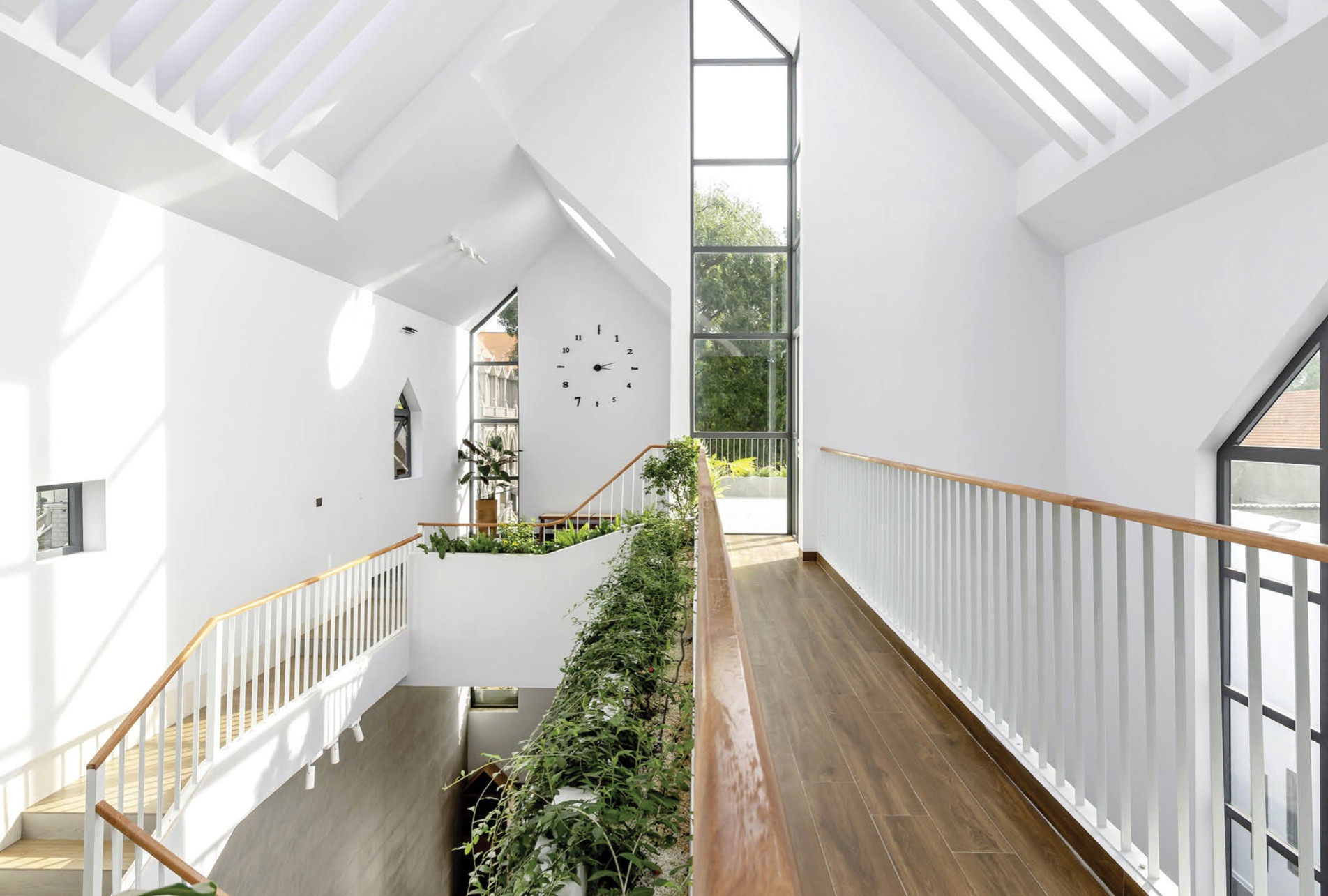 Tông chủ đạo ngôi nhà là màu trắng kết hợp với màu xanh của cây ở mọi góc, tạo nên sự bình yên.