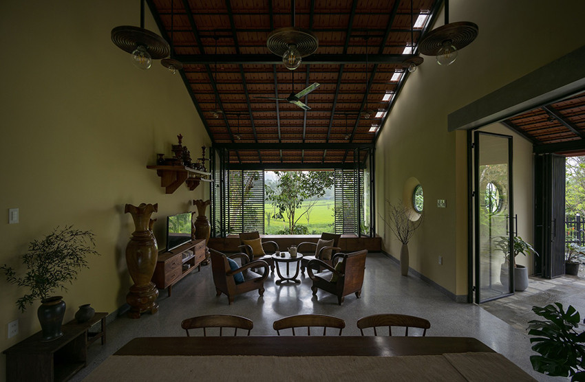Việc bố trí công năng để thiết lập hai trục thông thoáng tự nhiên theo phương đứng và phương ngang đã đảm bảo tất cả các không gian trong nhà phố đều được thông thoáng tự nhiên.
