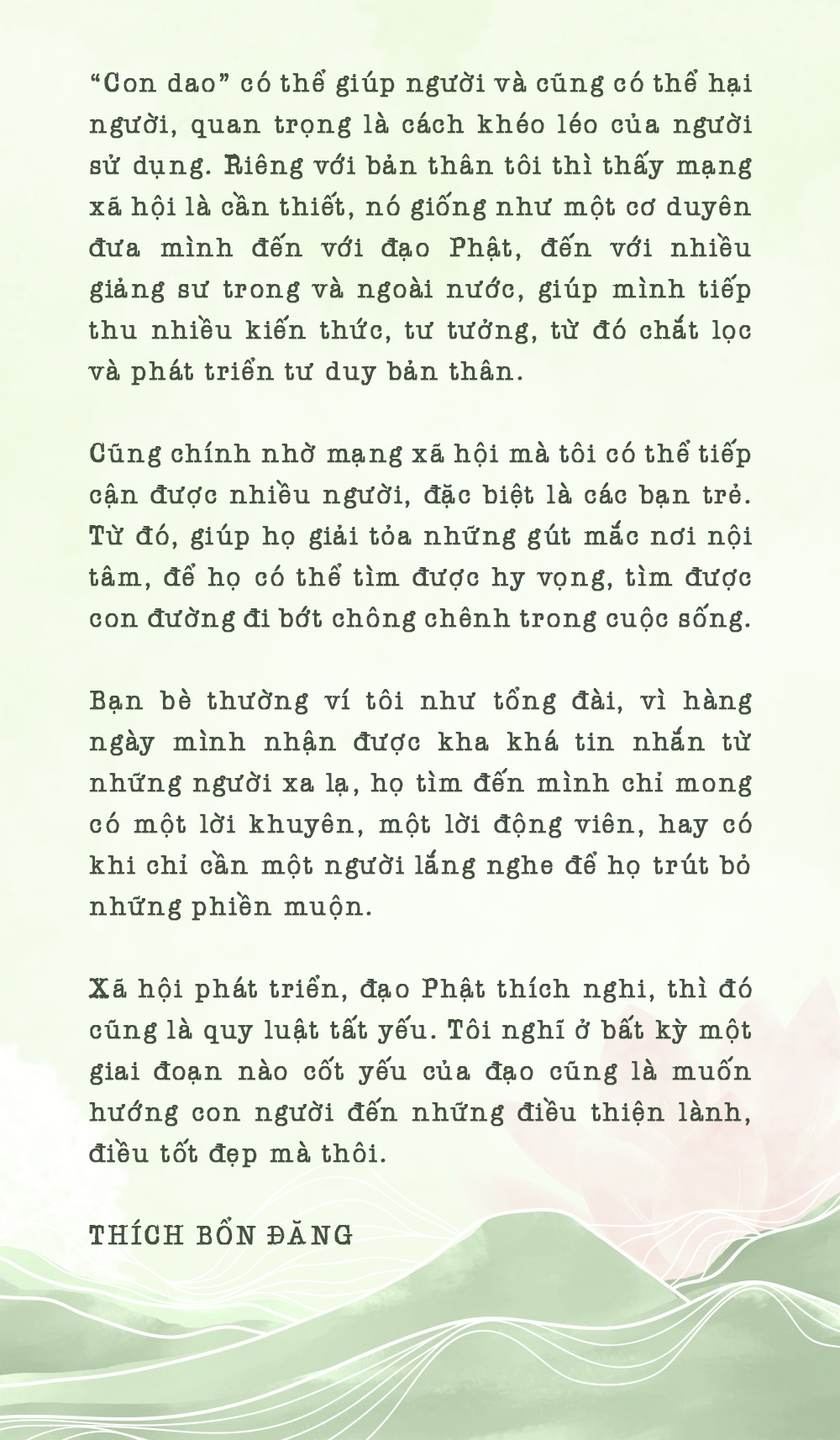 Tôi nghĩ khi đăng tải một điều gì lên mạng xã hội thì trước hết cần có nội dung, và sau là nội dung đó cần mang lại một thông điệp, một giá trị nhất định, hướng đến cộng đồng. Có thể là một câu chuyện vui để mọi người cùng hoan hỷ hoặc một câu chuyện ẩn dụ để người tu tự nhìn lại chính mình, cũng có thể là những câu chuyện truyền cảm hứng, mang đến động lực cho những người đang mất phương hướng trong cuộc sống... Miễn sao những nội dung truyền tải có giá trị thực sự.