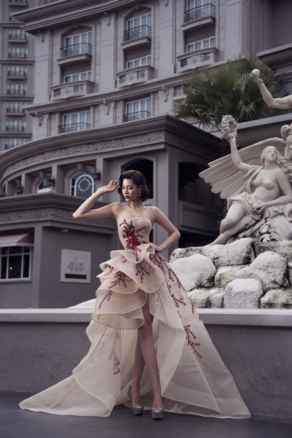 Siêu mẫu Khả Trang - giải Vàng siêu mẫu Việt Nam chính là nàng thơ trình diễn các thiết kế của NTK Anh Thư. |