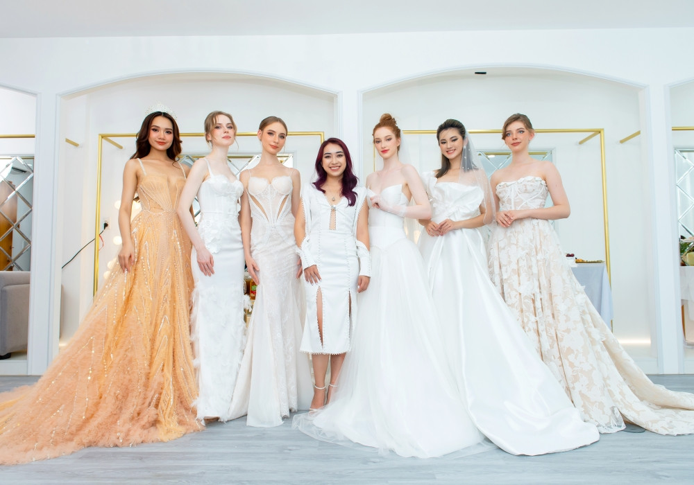 Các mẫu váy cưới của Tiana Van đa dạng về phom dáng từ đuôi cá, xẻ tà đến bồng xòe chữ A với những chi tiết phá cách như cut-out, xuyên thấu, diềm bèo, đính kết đá, lông vũ... nhằm khai thác tối đa vóc dáng, cá tính của người mặc.