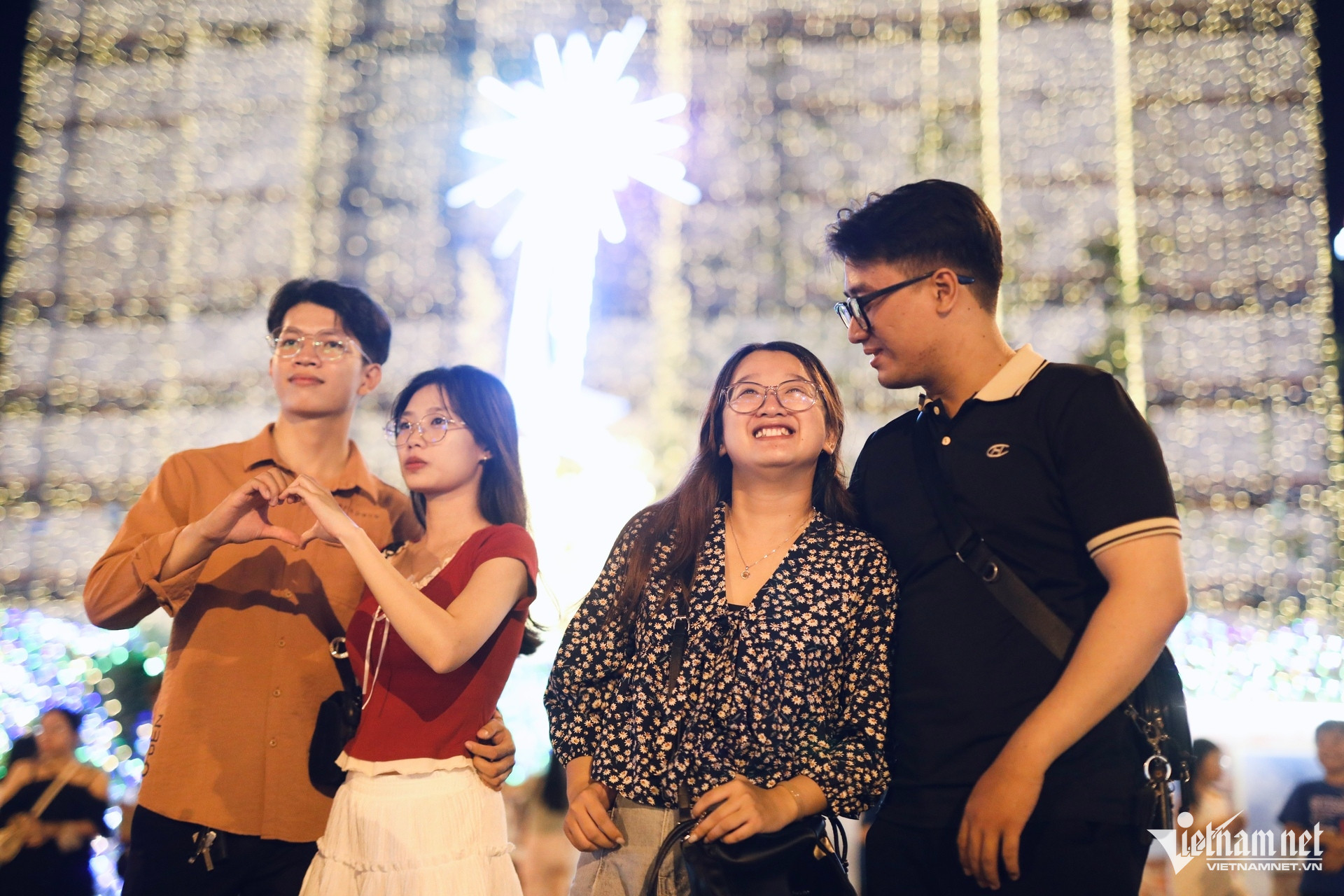 "Biết được thông tin nhà thờ thắp đèn đẹp lung linh nên mình rủ nhóm bạn tranh thủ cuối tuần ra chụp ngay bộ ảnh. Chưa Giáng sinh mà mọi người đổ về rất đông. Bên ngoài còn lung linh hơn những gì mình thấy trên mạng xã hội", Kim Ngân (bìa trái) chia sẻ.