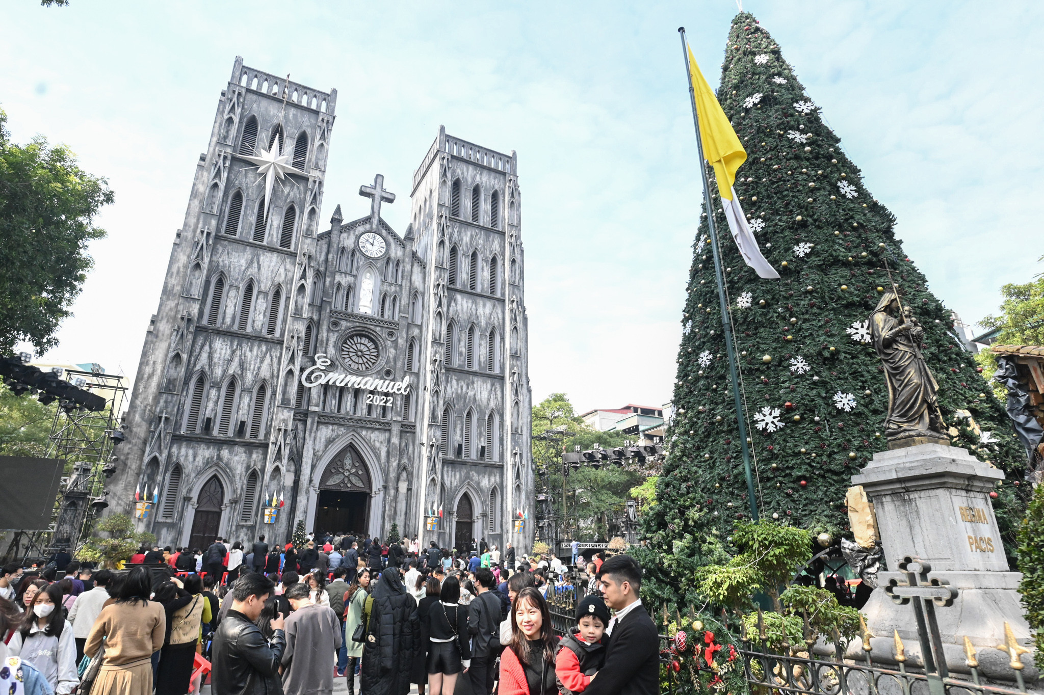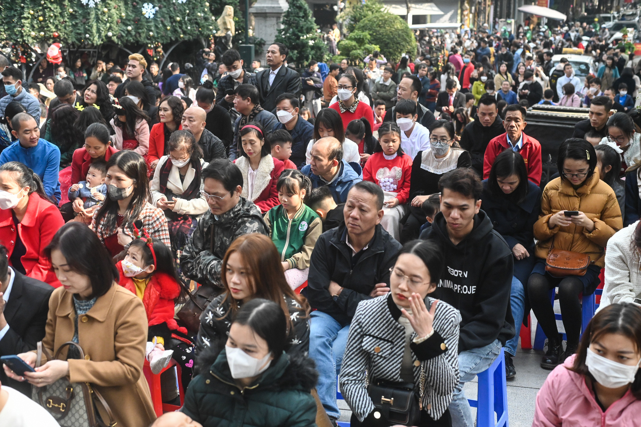 8h sáng 25/12, hàng nghìn người tập trung bên trong và ngoài Nhà thờ Lớn để vui chơi Giáng sinh. Trong đó, rất đông giáo dân có mặt để tham dự Thánh lễ đại triều - một trong hai lễ quan trọng nhất của đạo Thiên Chúa.
