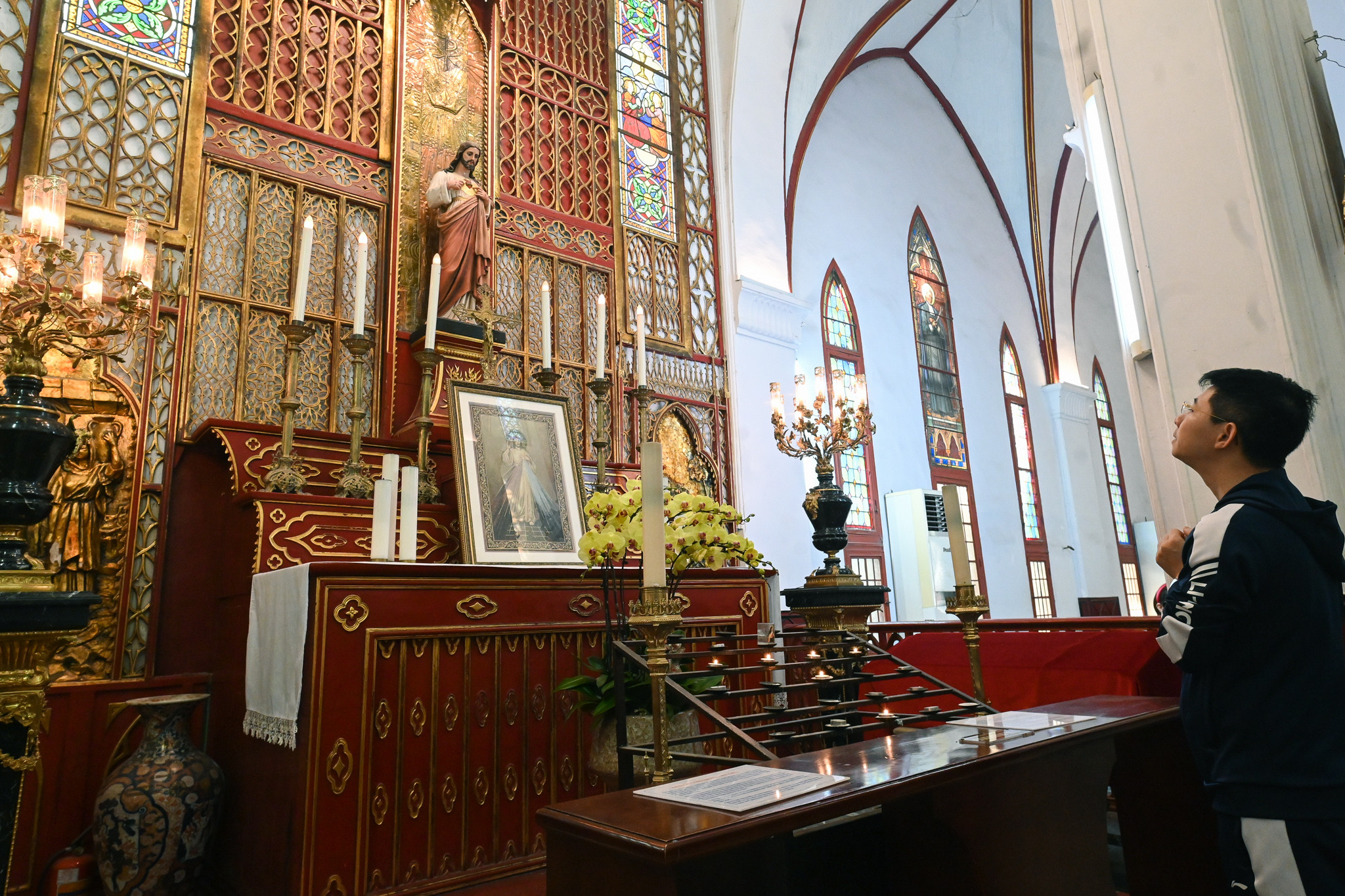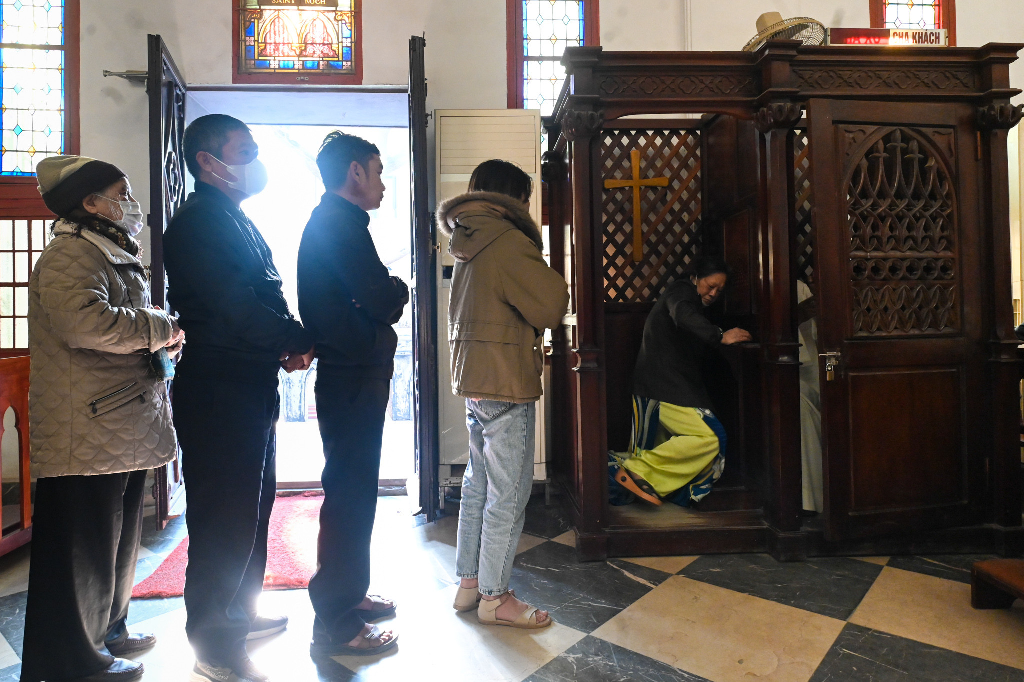 Bên trong Nhà thờ Lớn, trước giờ Thánh lễ diễn ra, nhiều người xếp hàng để được xưng tội với cha xứ.